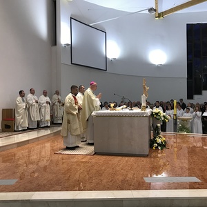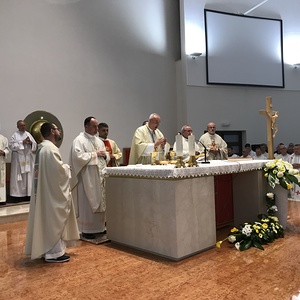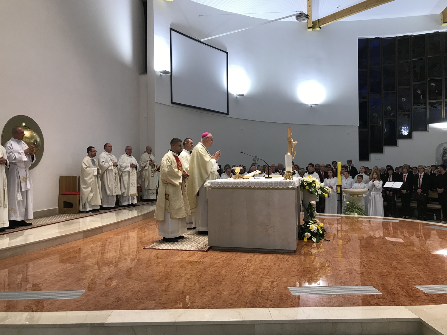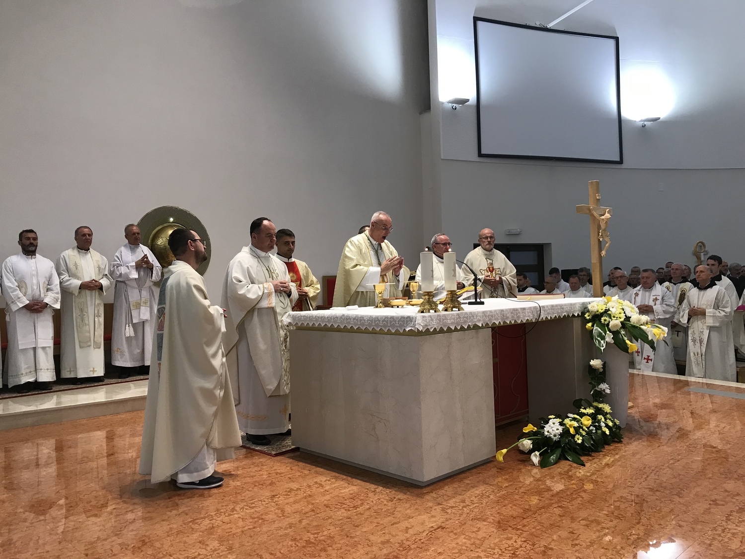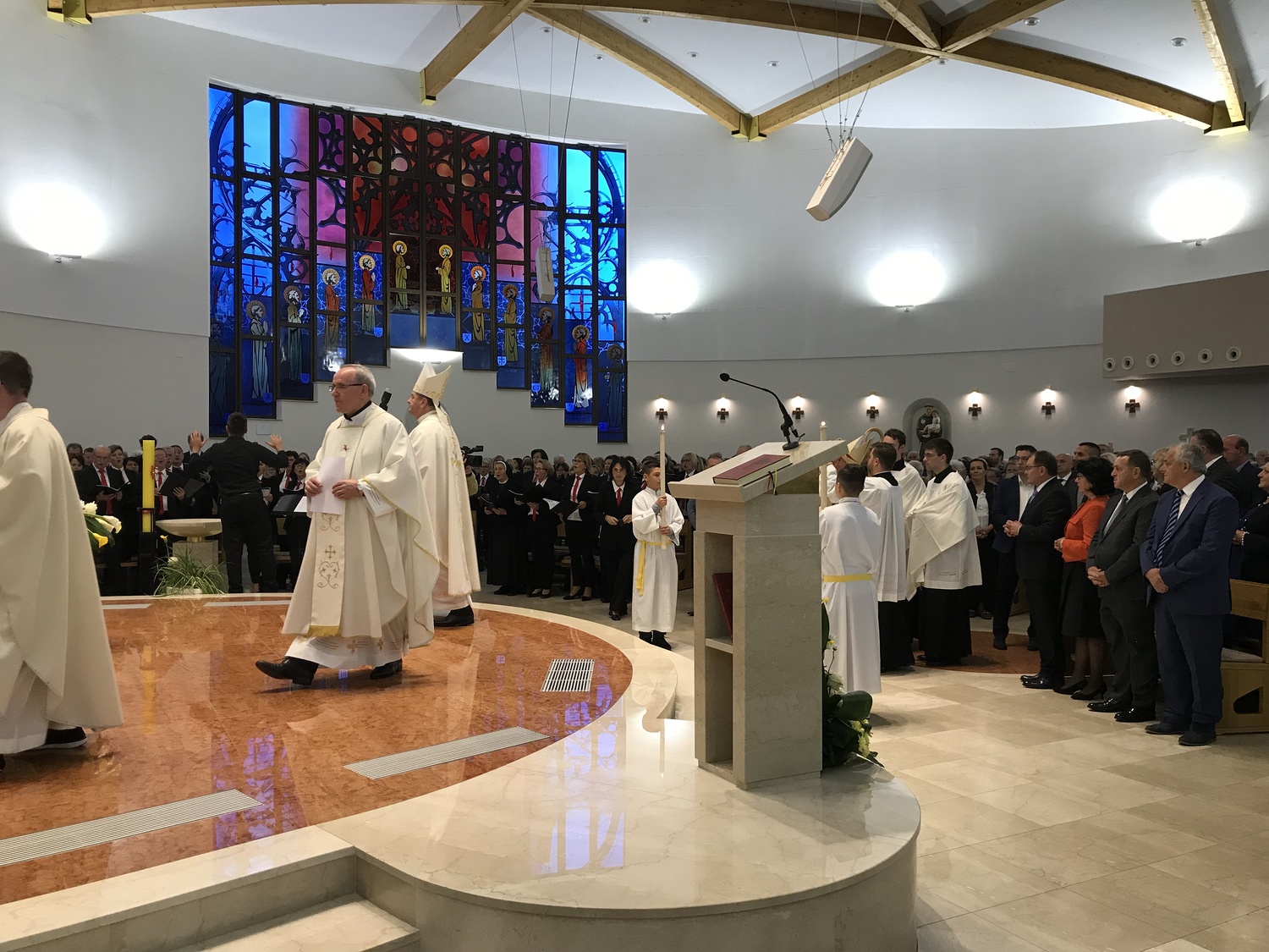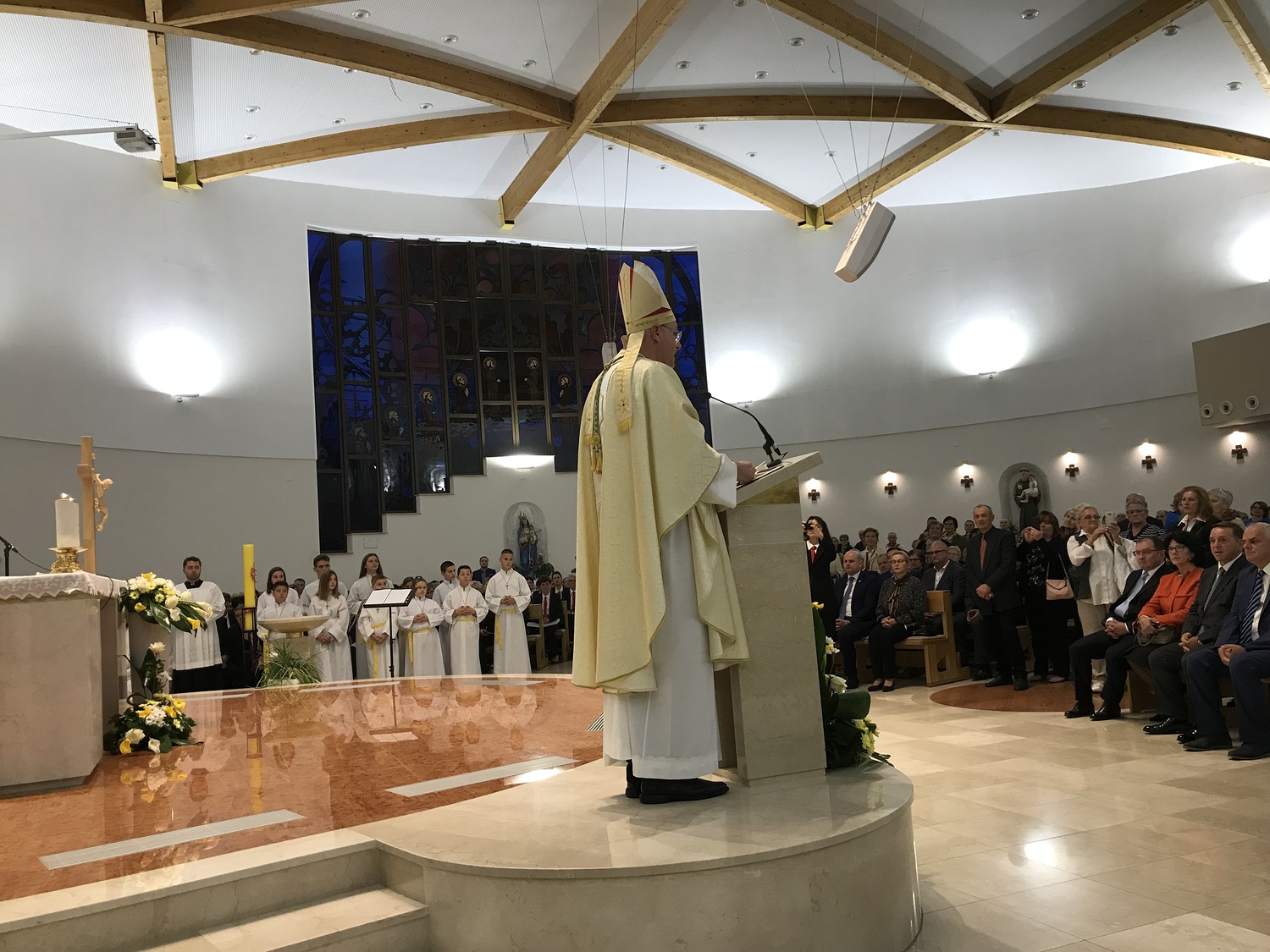 Der Besuch in der Zagreber Pfarrgemeinde Hl. Johannes XXIII. war ein wesentlicher Programmpunkt der burgenlandkroatischen Reise. Die Diözese Eisenstadt hatte für die neugebaute Kirche ein buntes Glasfenster gestiftet und Bischof Zsifkovics kam nun auf Einladung des Gemeindepfarrers Kristo Brkić, um die Kirche zu weihen. Brkić ist den Burgenlandkroaten kein Unbekannter: Sechs Jahre lang war er Pfarrer in Steinbrunn und Zillingtal. Der gebürtige Kosovo-Albaner entstammt so wie der bei der Kirchweihe ebenfalls anwesende Bischof von Hvar, Petar Palić, einer außerhalb Kroatiens lebenden kroatischsprachigen Minderheit im Kosovo. Als Diaspora-Kroaten sind beide Geistliche besondere Vertreter eines Christentums als Kraft, die die Grenzen von Nation, Rasse, Ideologie und Sprache überschreitet - eine Affinität, die sie mit Eisenstadts Bischof Ägidius Zsifkovics teilen. Verbindendes Element der Begegnung war aber auch die Tatsache, dass der Pfarrpatron der neuen Kirche, der heilige Papst Johannes XXIII., auch die Diözese Eisenstadt gegründet hat, die im kommenden Jahr ihr 60-Jahre-Jubiläum feiert.