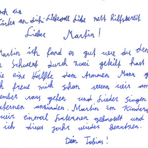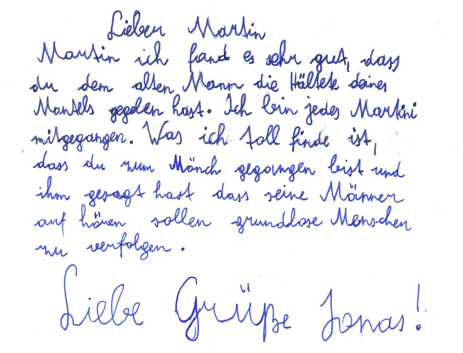 Mit erstaunlicher Direktheit und ungefilterter Betrachtungsweise gehen die jungen Autoren an die Ikone Martin heran. Sätze wie "Mich beeindruckt, dass du immer probiert hast, mit allen Menschen gut umzugehen" oder "Jeder Mensch kann dir danken, du bist einfach toll!" sind dabei nur die gängigeren Exempel, mit denen die Kinder Einblick in ihre Vorstellungen von Mensch und Welt, in ihre Auffassungen von gerecht und ungerecht, richtig und falsch geben. Liebeserklärungen an den Heiligen – "Schön, dass es dich gab!", "Du hast ein gutes Herz!" – finden sich ebenso in den Briefen wie moderne Rollenbilder ("Martin, du bist ein toller Mann!"), unkonventionelle Vorstellungen von Lebensplanung ("Es war schlau von dir, als Soldat aufzuhören und als Mönch weiterzumachen."), hinterfragte Karrierevorstellungen ("Wolltest Du überhaupt Bischof werden?") und sogar metaphysische Fragestellungen ("Ich frage mich, wie's dir jetzt geht").