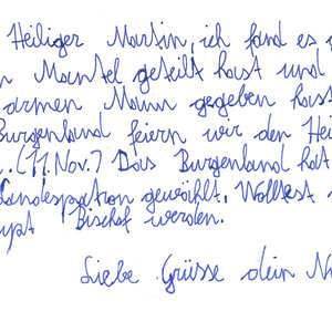 Es war eine engagierte Religionslehrerin an der Volksschule Mattersburg, Gudrun Gerdenitsch, die sich im Vorjahr mit einem Brief an den Eisenstädter Bischof gewandt hatte. Als Folge der Befassung mit einem Buch über den heiligen Martin (Heinz Janisch, "Der rote Mantel") hätten die Kinder ihrer Klasse den Wunsch geäußert, dem Heiligen persönliche Briefe zu schreiben. Diese wolle man zum 60-Jahr-Jubiläum der Diözese Eisenstadt widmen. Ende Jänner dieses Jahres machten sich dann die Schülerinnen und Schüler tatsächlich mit dem Bus auf den Weg nach Eisenstadt und überreichten Bischof Zsifkovics die von ihnen verfassten Briefe an den burgenländischen Landes- und Diözesanpatron. Die Sammlung ist seit heute als ständige Online-Galerie auf der Homepage der Diözese Eisenstadt zu sehen.