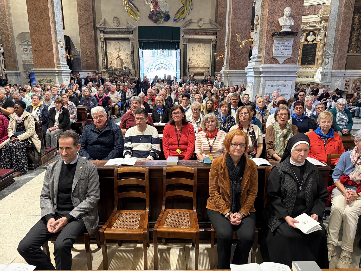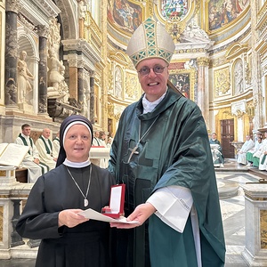 Am österreichischen Nationalfeiertag stand die Sonntagsmesse mit der deutschsprachigen Gemeinde Roms in der Kirche Santa Maria dell’Anima im Mittelpunkt. Ehrengast war der österreichische Botschafter beim Heiligen Stuhl, Marcus Bergmann. Im Rahmen dieses Gottesdienstes verlieh Bischof Zsifkovics der im Vatikan tätigen Sr. Vianney Chmielewska, einer Ordensfrau aus der Gemeinschaft der Borromäerinnen, den St. Martinsorden in Gold der Diözese Eisenstadt – als Zeichen der Anerkennung für ihren langjährigen, engagierten Dienst im Dienst des Heiligen Vaters und der Kirche in Österreich. "Sie verkörpern die Haltung des heiligen Martin: den Einsatz für andere, das Teilen von Zeit, Kraft und Gebet – stets im Geist des Evangeliums", so der Bischof in seiner Ansprache.