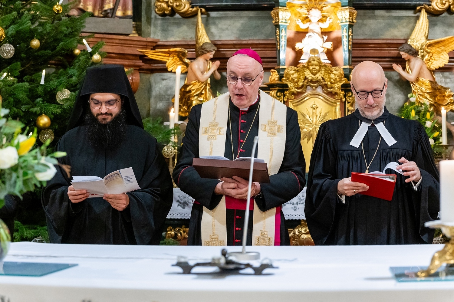 Bischof Ägidius Zsifkovics brachte seine Freude über die gemeinsame Feier mit Superintendent Robert Jonischkeit, Pater Raphael und den Gläubigen zum Ausdruck. Das gemeinsame Gebet der drei Kirchen zu Beginn des Gottesdienstes hat seinen Ursprung in der Armenisch-Apostolischen Orthodoxen Kirche. Dieses Sonnenaufgangsgebet ist besonders jenen gewidmet, die ihren Glauben nicht leben und bezeugen dürfen. Es geht auf die täglichen Gebetszeiten der Armenischen Kirche zurück und wurde von einem bedeutenden Katholikos, Theologen, Liturgiereformer und frühen ökumenischen Brückenbauer formuliert.