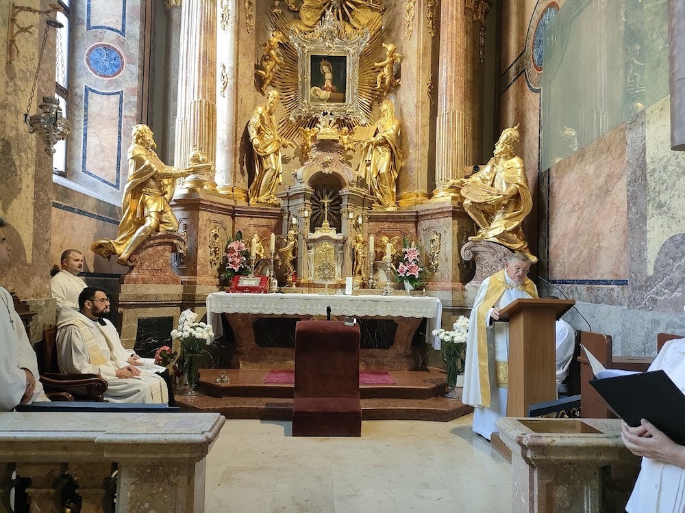 Wir sind in diese wunderschön restaurierte Kathedrale der Mutter von Györ, zu dieser alten Quelle unseres Glaubens gekommen, um unsere müden, trüben, blinden und traurigen Augen vor dem barmherzigen Bildnis der „tränenreichen Jungfrau Maria“ zu waschen und sie um ihre Fürsprache bei ihrem Sohn Jesus zu bitten, damit in unseren Familien, Kirche und Gesellschaft LIEBE, FREUDE, FREUNDSCHAFT und GEMEINSCHAFT zurückkehre und vor allem das der FRIEDE zurückkehre in die Ukraine und das Heilige Land!