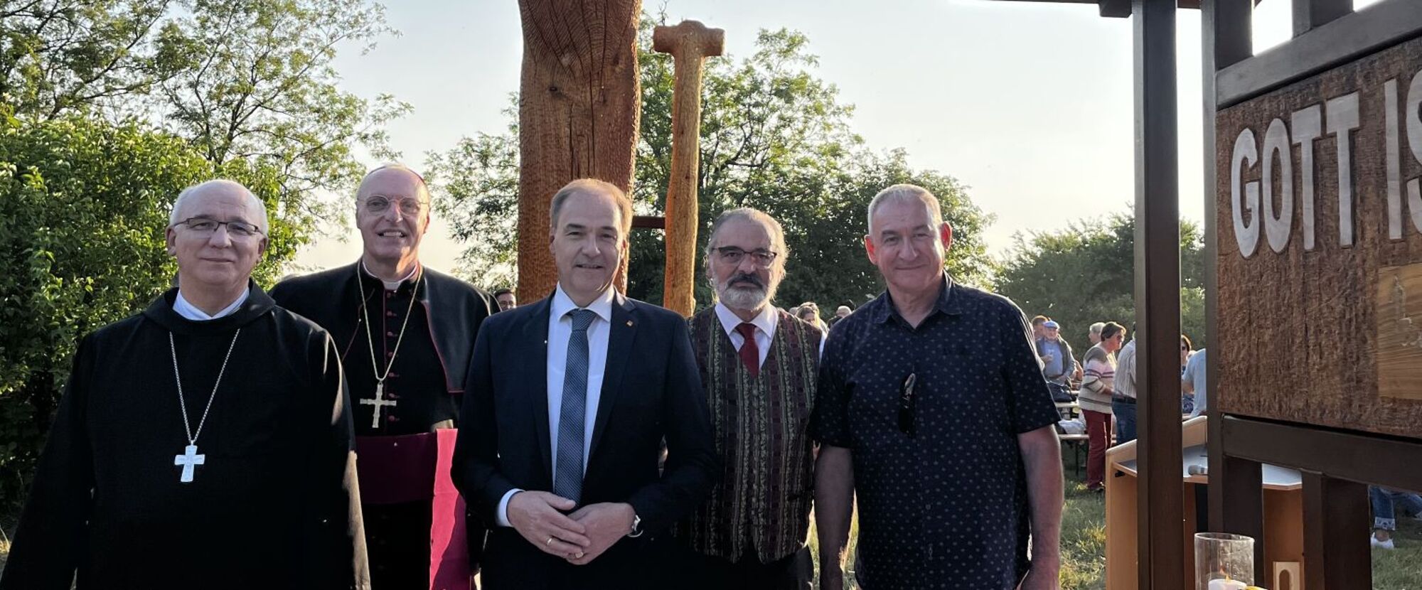„Das Denkmal erinnert an die Opfer von Gewalt, Krieg, Diktatur und Terror – gestern wie heute – besonders an die Opfer der Tat am Pfingstdienstag in Graz. Wir dürfen keine Anwälte des Todes sein, sondern müssen Propheten des Lebens werden“, betonte Bischof Ägidius Zsifkovics. „Die Gedenkstätte erinnert auch an die Zwangsarbeiter, die beim Bau des nie vollendeten Südostwalls leiden und sterben mussten – unter ihnen war auch der junge Joseph Ratzinger, der spätere Papst Benedikt XVI. Dank galt dem Land Burgenland, der Erzabtei Pannonhalma, der Gemeinde Deutsch Jahrndorf und dem Künstler Daniel Bucur. Die Stätte soll ein Ort der Erinnerung, der Stille und der Hoffnung sein – getragen von der Botschaft: Gott ist die Liebe“, so der Bischof weiter.