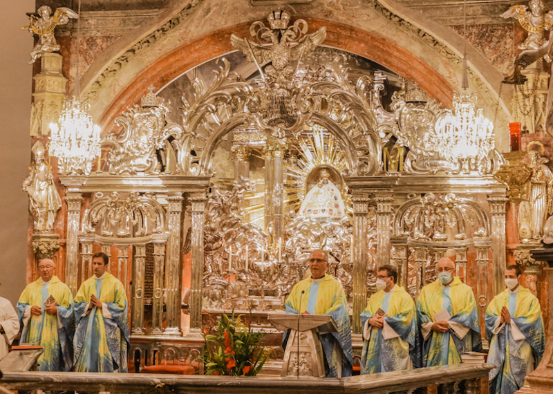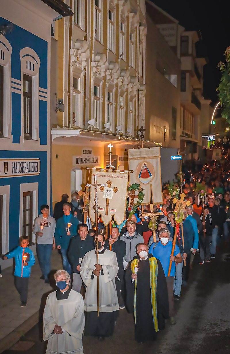 Die feierliche Messe um 19:00 Uhr wurde von der Pfarre Zillingtal und der Tamburizza Zillingtal unter Leitung von David Suttner würdig gestaltet. Pfarrer Mag. Ignaz Ivanschits umriss in seiner Predigt die Umstände, die mit der Aufnahme der Wandermuttergottes in Zillingtal verbunden waren, und welche geistlichen Früchte daraus erwachsen sind. Ein einmaliges Erlebnis war wieder die große Lichterprozession durch die Stadt rund um die Basilika. Gläubige aus Zillingtal in ihrer Tracht trugen die Wandermuttergottes, und in der Basilika sang eine Männerscola unter Leitung von Kantor Stefan Bubich die Marienlieder, sodass auch die Gläubigen draußen in die Gesänge einstimmen und gemeinsam mitsingen konnten.