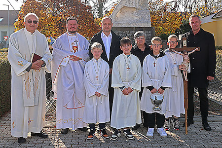 Zu Allerheiligen zogen die Menschen nach der hl. Messe in Prozession zum Kriegerdenkmal. Dort erinnerten Pfarrer MMag. Franz Borenitsch und Pfarrer Mag. Predrag Ivandić im Gebet an die Opfer von Krieg, Unheil, an zivile und jüdische Opfer. Bürgermeister Karel Lentsch und der stellvertretende Bürgermeister Andreas Mikula legten einen Kranz nieder, Pfarrgemeinderatsmitglied Gabi Laczko las die Fürbitten. Kantor Martin Miletić sang mit den Anwesenden. Vielen Dank an alle.