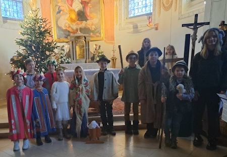 Am Weihnachtsabend um 15.00 Uhr am Nachmittag haben die Kinder unter der Leitung von Frau Lehrerin Christine Egger ein Krippenspiel von der Geburt des Jesuskindes vorbereitet. Pfarrer MMag. Franz Borenitsch betete mit den Anwesenden und erteilte den Segen. Danke an alle.