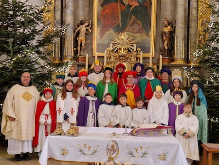 Die Heiligen Drei Könige mit Pfarrer Zoran Tadič in der Pfarrkirche von Kroatisch Minihof.
