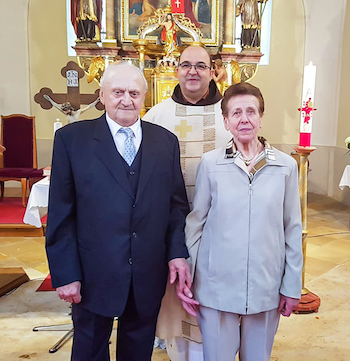 Svetačnu svetu mašu služio je p. Zoran Tadić OFM. Na početku sv. maše je p. Zoran najsrdačnije pozdravio jubilare Julku i Rudija s njihovom dicom i rodbinom. Naglasio je, da u svoji skoro dvadeset i pet ljeti kot farnik još nije mogao svečevati i blagosloviti jubilare, ki svečuju 65. objetnicu svojega vjenčanja. Ovo je milost i dar Božji, koga im je naš nebeski Otac darovao. Jubilari vjerno sudjeluju pri nediljni sveti maša.