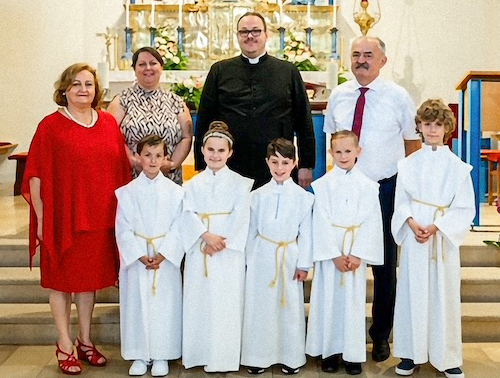 Nedilju, 22. maja je bilo prvo pričešćanje u Pinkovcu. Petero dice primilo je prvi put Tijelo Kristuševo: Feliks, Ana, Jan, Nico i Milo (na sliki od liva na desno).