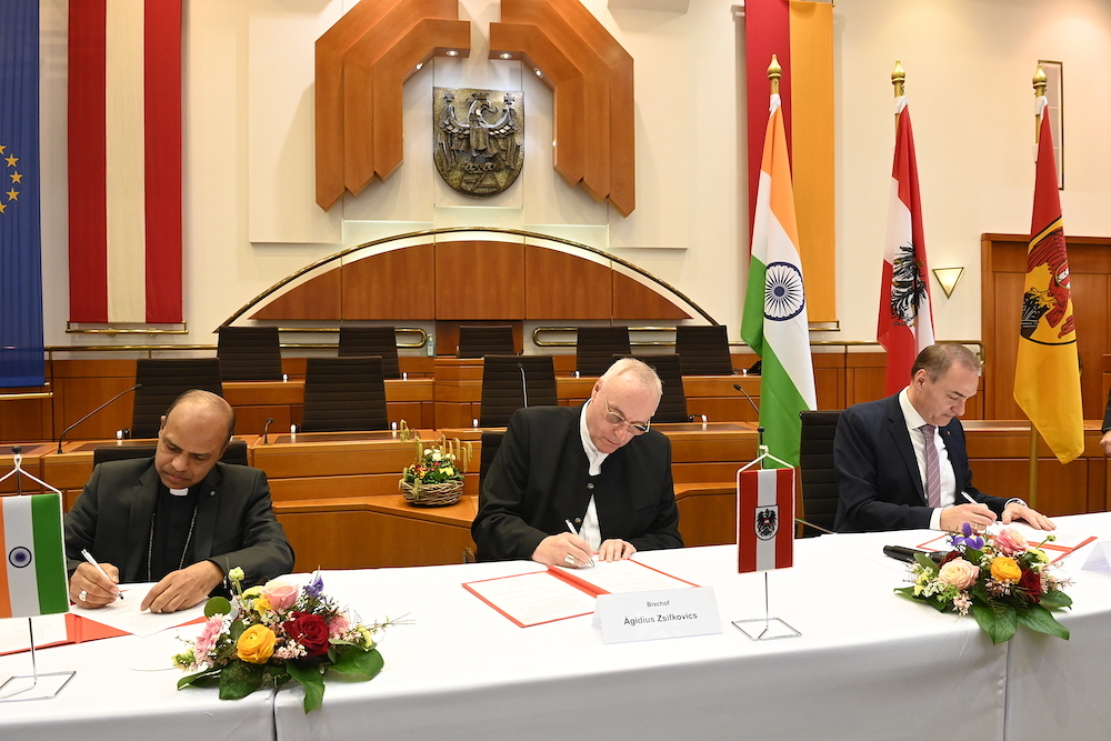 Zemlja Gradišće, Željezanska biškupija i nje indijska partnerska biškupija Kanjirapally jur dugo dobro suradjuju. To je peljalo do ideje o udruživanju snag na području skrbi i podvaranja. Zemaljski savjetnik Leonhard Schneemann, biškup indijske biškupije Kanjirapally Jose Pulickal i željezanski dijecezanski biškup Egidije Živković su srijedu potpisali zajedničku izjavu o namjera u vladi u Željeznu. „Gradišće se je u poslidnji ljeti pozicioniralo kot svitionik na području skrbi i podvaranja u Austriji. Medjutim nas demografski razvitak i potriboća za skrb i podvaranje, ka iz toga proizlazi, postavljaju pred veliku zadaću. Polag prognozov se do 2030. očekuje dodatna potriboća za oko 1.750 medicinskih sestar, prem intenzivnih aktivnosti obrazovanja u samom Gradišću. Naši dosadašnji napori u obrazovanju, koliko god bi oni važni bili, sami nećedu biti dovoljni, da zadovolju ovu potriboću. Zato moramo proširiti perspektivu i pronajti nova rješenja. Jedan od tih pristupov je medjunarodna suradnja u zapošljavanju kvalificiranoga medicinskoga osoblja“, istaknuo je zemaljski savjetnik Schneemann prilikom potpisivanja.