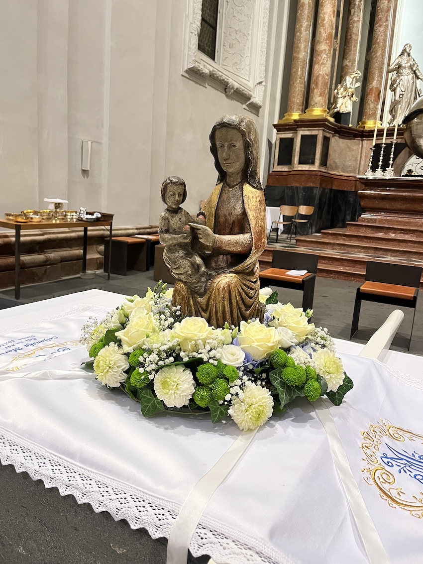 Glavna svetačna sveta maša bila je u deseti ura. Glavni celebrant mašnoga slavlja je bio vlč. Štefan Jahns iz Vulkaprodrštofa u koncelebraciji hrvatskih svećenikov, a muzički su oblikovali svetu mašu tamburica “Poljanci” i kantor Kristijan Artner iz Vulkaprodrštofa. Ćutila se je nediljna svetačna atmosfera pri svetoj maši, ali je človik u sebi oćutio, da je došlo vrime i rastanka. Fara Vincjet se je otpodne oprostila od kipa Blažene Divice Marije Celjanske, a Vulkaprodrštof je preuzeo kip Majke Božje. Teško se je lučiti od kipa Putujuće Marije Celjanske. Kip ima u svakoj crikvi lipo iskinčeno mjesto. Neka polag lipih kitic iz vrta kinču kip i molitva, marijanske jačke i naša nazočnost u crikvi.