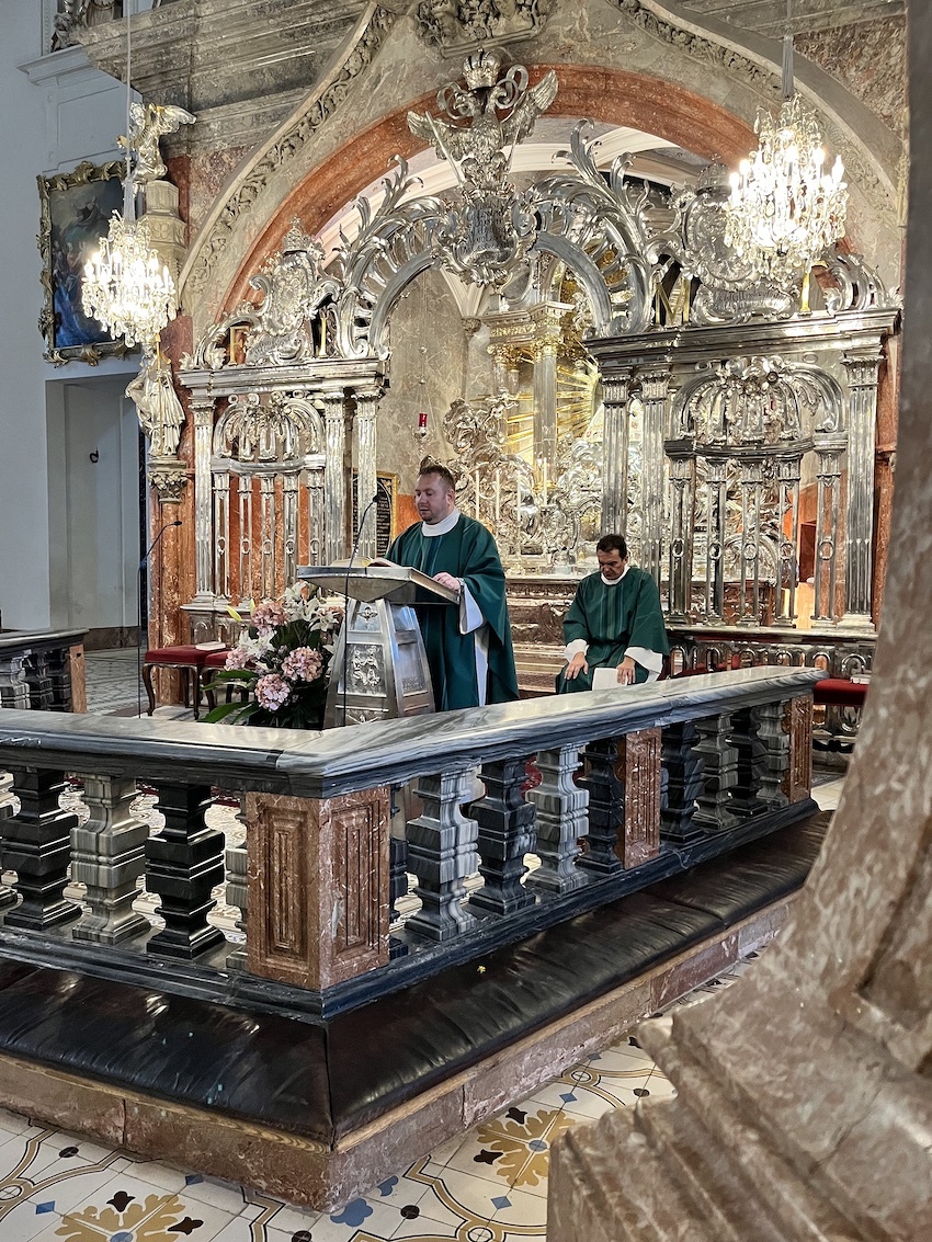 Nedilja je začela jutro sa svetom mašom u sedmi ura za pokojne, ku je predvodio vlč. Marko Zadravec. Ove svete maše jutro su osebujno lipe. Tišina nam daje mogućnost, da zaistinu uživamo u miru mjesta, u miru bazilike. Jutarnje maše su dale neki poseban osjećaj za sve, ki su bili nazoči. Hodočasna mjesta su gusto prepuna, ali u jutarnje vrime se človik more u miru predati molitvi i peljati razgovor s Bogom. Kantor ovoga mašnoga slavlja je bio kantor Martin Herić iz Čembe.