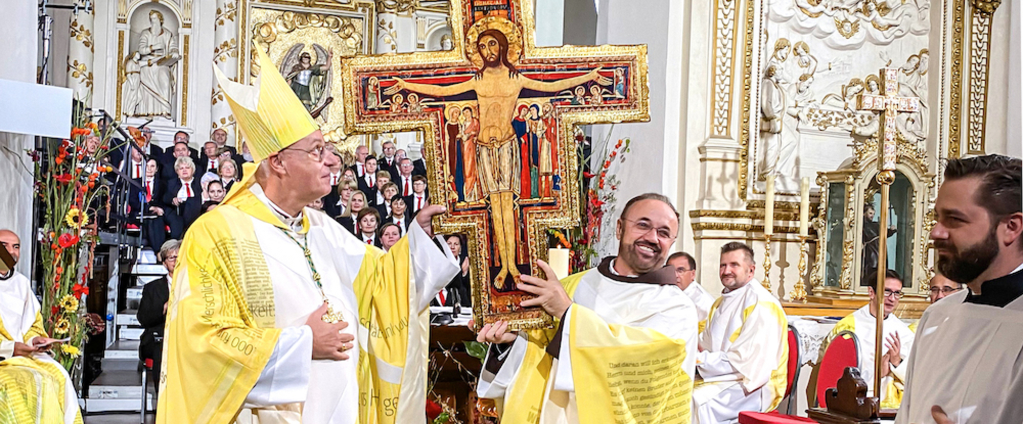 U 10.00 ura svečevao je biškup dr. Živković prvu svetu mašu na standardnom hrvatskom jeziku, ku je prenosio Hrvatski radio i televizija HRT. Koncelebrirali su definitor p. Vinko Sičaj OFM, delegat provincijala p. Zdravka Dadića OFM, biškupski vikar za hrvatske posle Željezanske biškupije kan. mag. Željko Odobašić, farnik stolne crikve u Željeznu kan. p. mag. Achim Bayer, ki se skrbi i za ovu crikvu, ter p. mag. Božidar Blažević OFM, komu je povjerene djelo izgradnje nove misije, ter pomoćniki pri tom djelu p. Zoran Tadić OFM, p. Stjepan Lukašević OFM, i mmag. Ivan Vukčević. Svetu mašu oblikovali su zbor “Pax et Bonum” ter tamburaši “Koprive”. Pred crikvom bio je postavljen video-zid za praćenje maše vani.