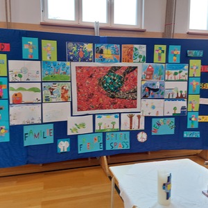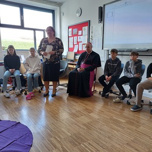 Weiter ging der Vormittag an der Mittelschule Kobersdorf. "Der Herr ist mein Hirte" war hier der Leitsatz der ökumenischen Wort-Gottes-Feier, an der auch Kinder und Lehrpersonen der örtlichen Volksschule und Pfarrmoderator Shinto Varghese Michael teilnahmen. Im folgenden Besuch in der ersten und zweiten Klasse wurde gerappt, ein Kahoot-Quiz gespielt und der Osterfestkreis als Bodenbild gelegt. Es blieben auch ein paar Minuten Zeit, um mit dem Herrn Bischof ungezwungen zu plaudern - sowohl für die Schüler*innen als auch für das Lehrpersonal. Herzlichen Dank an dieser Stelle an Kolllegin Doris Horvath, die evanglische Religionslehrerin Martina Köppel und Direktorin Carina Werba für ihr Engagagement in der Gestaltung des abwechslungsreichen Vormittags.