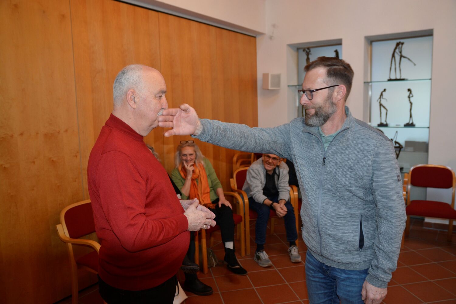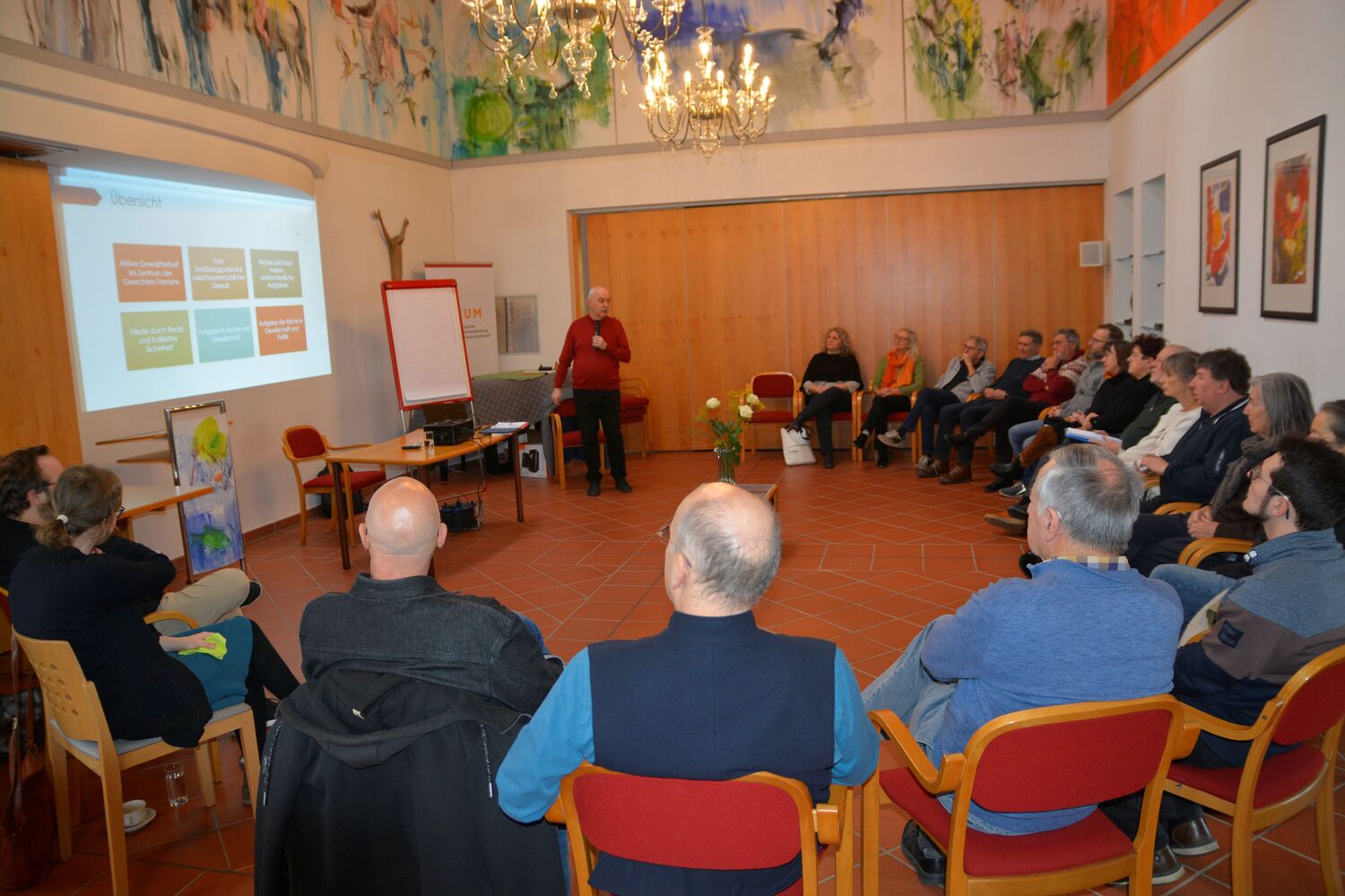 Wenn in unserer Zeit die Rüstungsausgaben immer weiter in die Höhe geschraubt werden, scheinen jene Stimmen, die diese Politik hinterfragen, ungehört zu verklingen. Im Workshop am Samstag legte Prof. Palaver in sechs Schritten vor, wie Alternativen zu dieser Aufrüstungslogik aussehen können. Basis seines Befundes ist eine empirische Studie, die in mehr als 300 untersuchten Fällen (1940 – 2006) aufzeigt, das gewaltfreie Verteidigung effizienter und nachhaltiger ist! Das elektrisierte förmlich viele TeilnehmerInnen und ihre schnellen Einwürfe und Fragen irritierten zunehmend den Referenten. Werden Fakten angezweifelt oder Denkmodelle? Unserer Gruppe wurde klar, dass der Weg zum Frieden viele Hindernisse zu überwinden hat. Es geht um Vertrauen und um Geduld, damit Tatsachen sichergestellt und Missverständnisse ausgeräumt werden können. Nach dieser 20-minütigen „Extrameile“ wuchs das Bedürfnis, Schritt für Schritt vorzugehen.