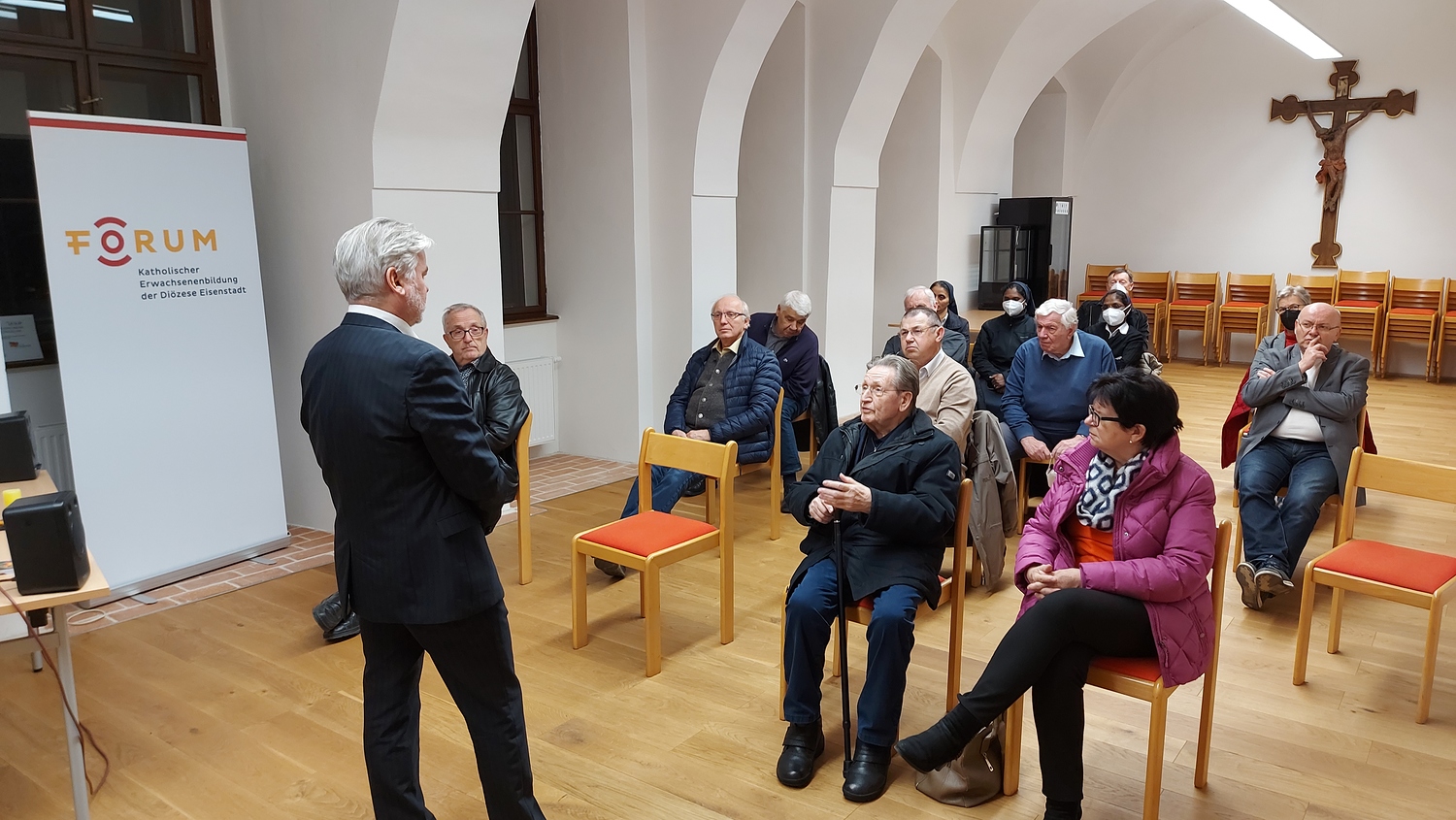Am 16. November 2021 gab es im Kloster Frauenkirchen einen Vortragsabend der Regionalstelle Nord zum Thema Verfolgte Christen weltweit. Der Nationaldirektor der internationalen Hilfsorganisation Kirche in Not, Herbert Rechberger, referierte über dieses schwierige und betroffen machende Thema, u.a. auch von seinen Projektreisen vor Ort in verschiedenen Ländern. Aufgelockert durch zwei kurze Videos konnten die Teilnehmer/-innen einen guten Einblick in die Situation von Christen in Not gewinnen, die aufgrund ihres Glaubens diskriminiert, unterdrückt oder sogar offen verfolgt werden. Im Anschluss daran gab es eine zum Teil engagierte Diskussion der Anwesenden mit Fragen und Antworten zum Thema. Mit einem kurzen Innehalten und Gebet fand der Abend seinen Ausklang. Am Ende gab es noch die Möglichkeit, mit dem Referenten und untereinander ins Gespräch zu kommen. Aus Anlass des Abends und im Rahmen der internationalen Aktion „Red Wednesday“ (https://www.kircheinnot.at/allgemein/aktuelles/red-wednesday-2021/) wurde die Basilika Frauenkirchen rot angestrahlt, um so auf das Schicksal der verfolgten Glaubensgeschwister hinzuweisen.