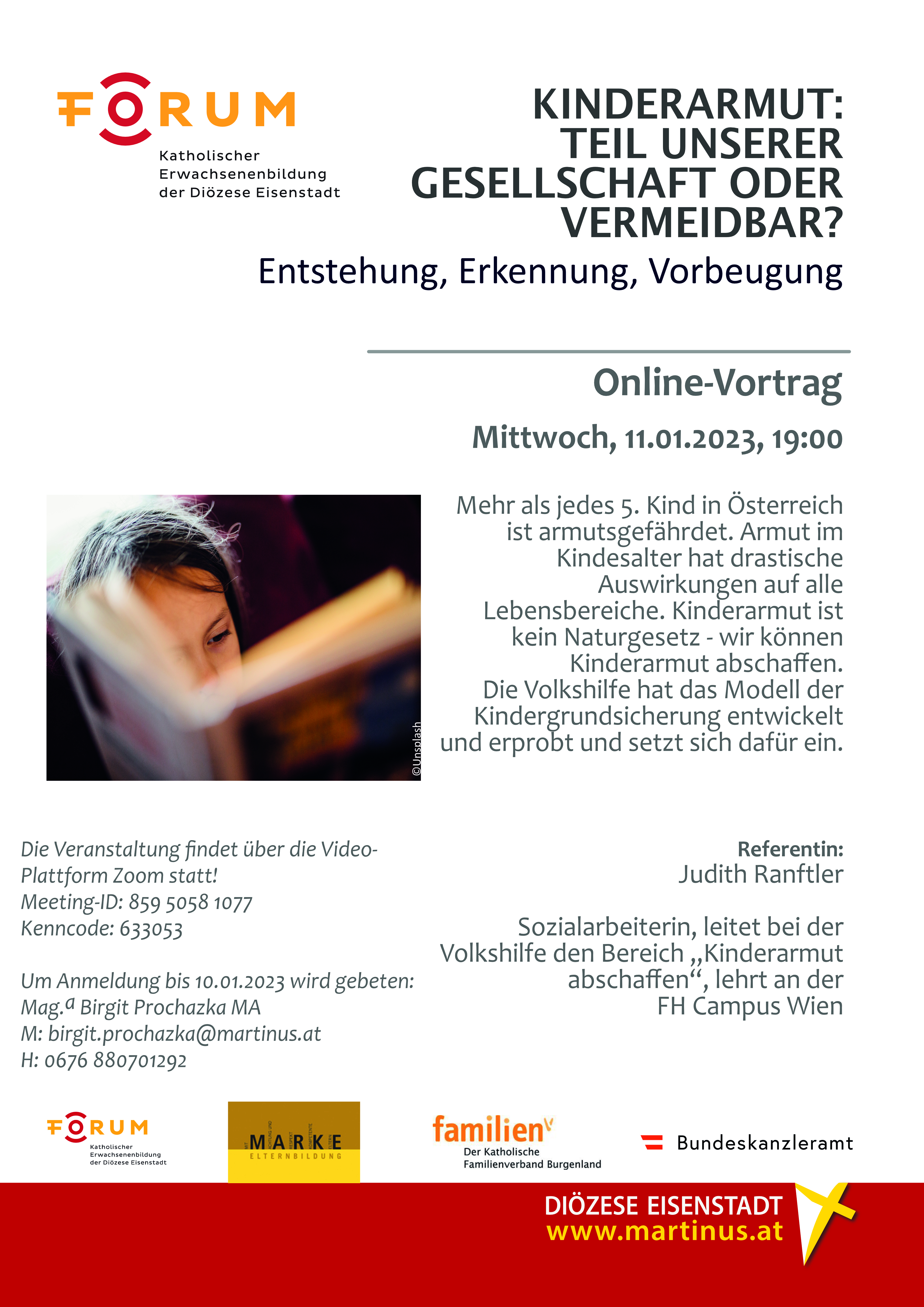 Mehr als jedes 5. Kind in Österreich ist armutsgefährdet. Armut im Kindesalter hat drastische Auswirkungen auf alle Lebensbereiche. Kinderarmut ist kein Naturgesetz - wir können Kinderarmut abschaffen. Die Volkshilfe hat das Modell der Kindergrundsicherung entwickelt und erprobt und setzt sich dafür ein. Judith Ranftler, die Leitern des Bereichs "Kinderarmut abschaffen" der Volkshilfe, spricht in einem Online-Vortrag am 11.01.2023 um 19.00 über die Entstehung, das Erkennen und das Vorbeugen von Kinderarmut.