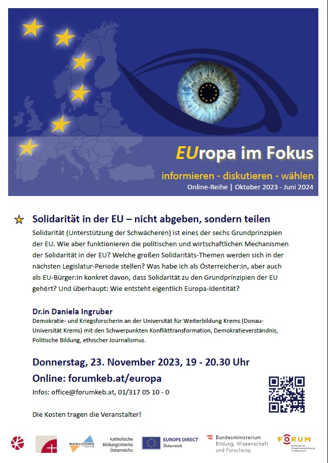 Solidarität bedeutet nicht, dass ich etwas abgebe, was ich nicht brauche. Solidarität bedeutet vielmehr, dass ich etwas teile, was ich habe. Wie aber funktionieren die politischen und wirtschaftlichen Mechanismen der Solidarität in der EU? Welche großen Solidaritäts-Themen werden sich in der nächsten Legislatur-Periode stellen? Was habe ich als Österreicher:in, aber auch als EU-Bürger:in konkret davon, dass Solidarität zu den Grundprinzipien der EU gehört? Was können Bürger:innen umgekehrt für Europa tun? Und überhaupt: Wie entsteht eigentlich Europa-Identität?