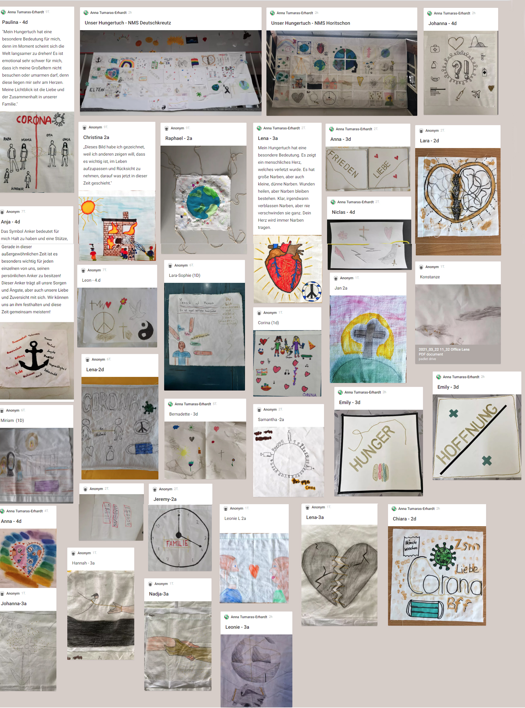 „Hoffnung“ zu philosophieren. Die 1. – 4. Klassen sollten sich mit ihrem persönlichen Leid und dem Leid der Welt auseinandersetzen. Auf den teils dunkel gestalteten Tüchern weisen aber die Goldfäden auf Hoffnung und Wandel hin ...