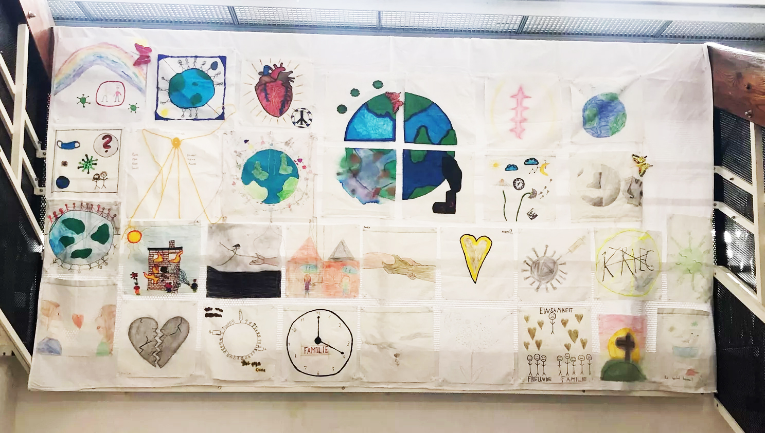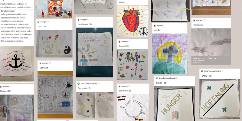 „Hoffnung“ zu philosophieren. Die 1. – 4. Klassen sollten sich mit ihrem persönlichen Leid und dem Leid der Welt auseinandersetzen. Auf den teils dunkel gestalteten Tüchern weisen aber die Goldfäden auf Hoffnung und Wandel hin ...