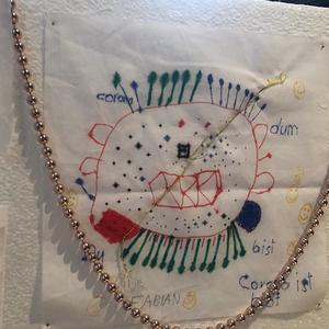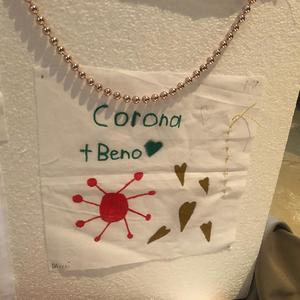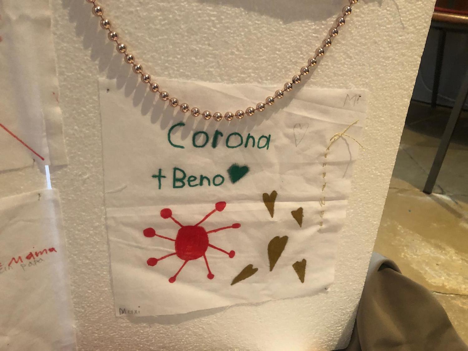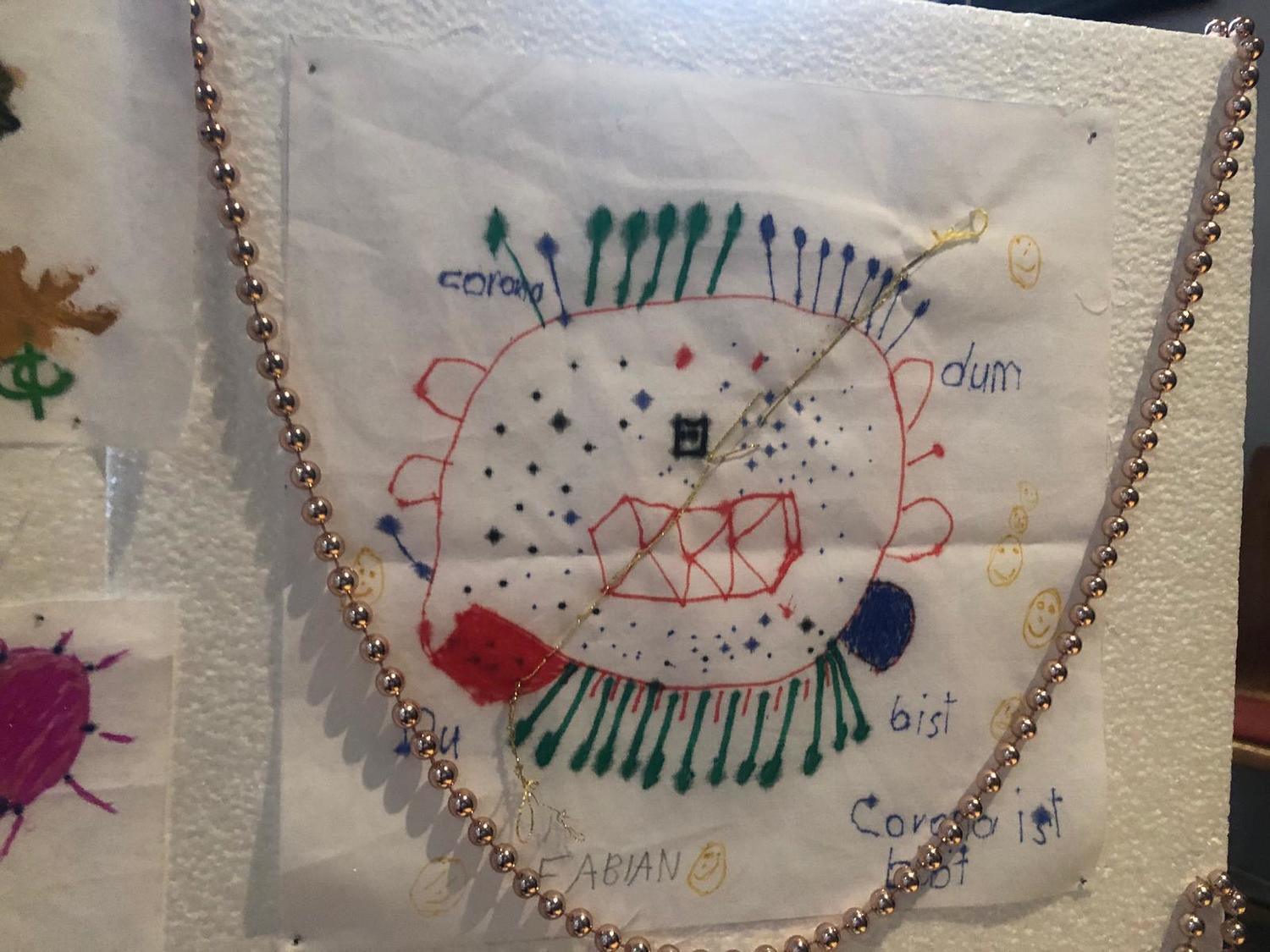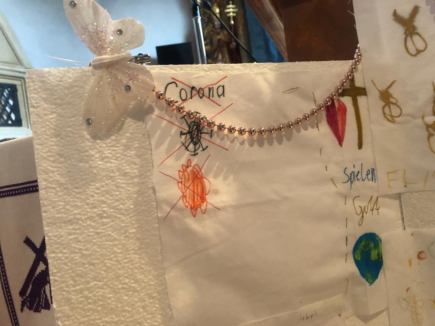 Der goldene Faden zog sich durch die Heftarbeiten weiter bis hin zum Hungertuch. Gott ist immer bei uns und ermöglicht Heil – ausgedrückt durch den goldenen Faden. Schmetterling und goldene Hoffnungssymbole sollen uns daran erinnern, trotz schwierigen Zeiten nicht die Hoffnung zu verlieren, Hoffnung auf Wandel und neues Leben.