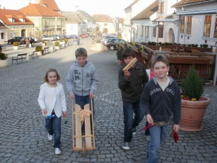 Ab der Ölbergstunde bis zur Auferstehung rufen uns die Osterratschen-Kinder mit dem Spruch - " Wir ratschen, wir ratschen den Englischen Gruß, den jeder Christ beten muss" zum Gebet bzw. zur hl. Messe.