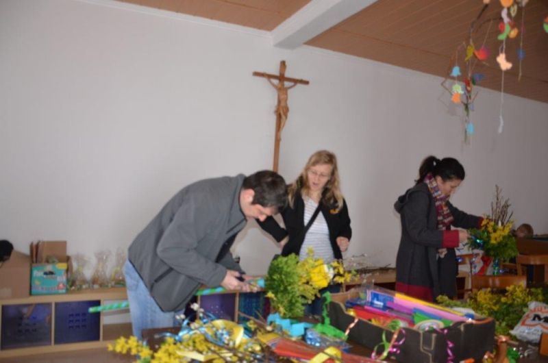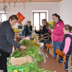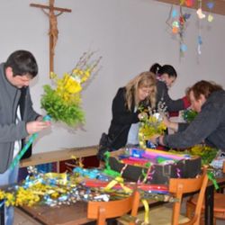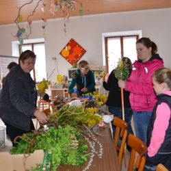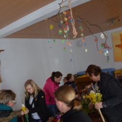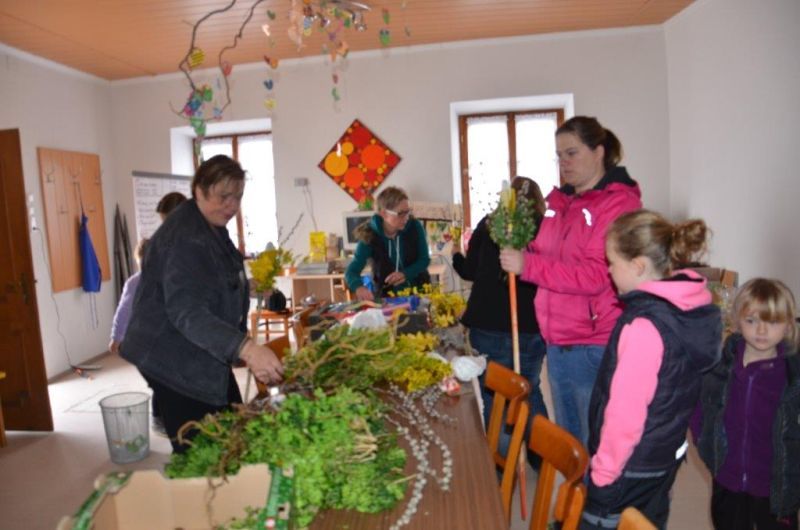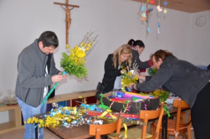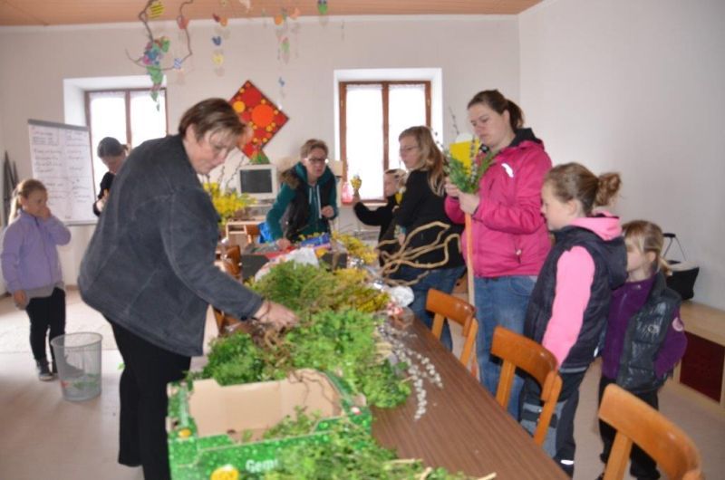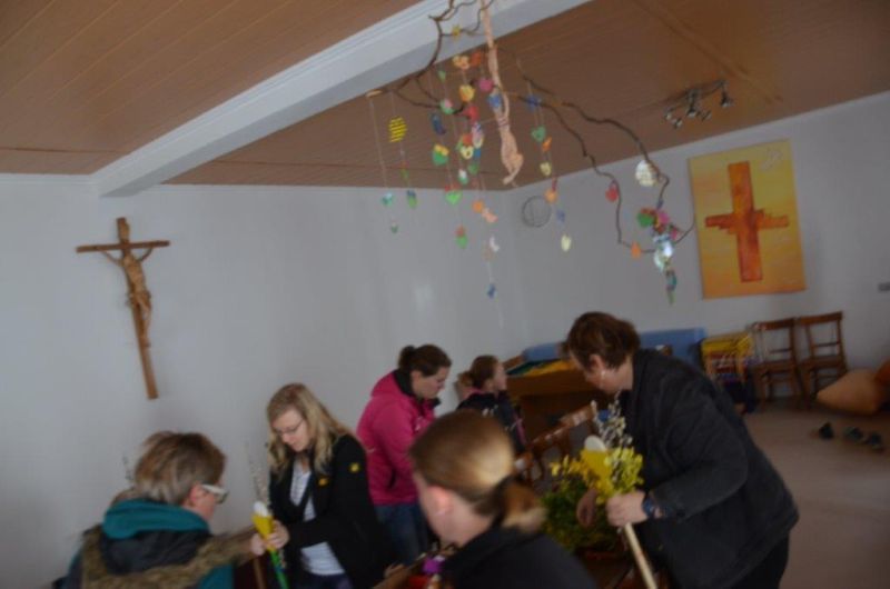 Erstkommunionkinder und ihre Eltern beim Palmbuschenbinden für die Palmsonntagsprozession