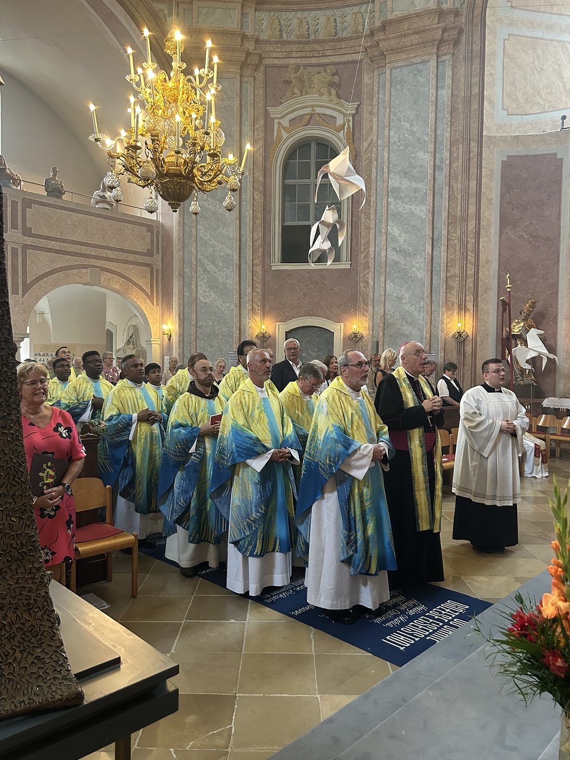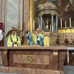 Hauptamtliche Mitarbeiter, sowie die Pfarrgemeinderäte der beiden Pfarren - angeführt durch die beiden Kuratoren Hans Skarits und Kerstin Kosky - übergaben symbolisch die Kirchenschlüssel und brachten Wein und Brot zur Feier der Eucharistie. Zahlreiche Ordensfrauen und -Männer, Priester, der Regens des Wiener Priesterseminars, Redemptoristenpatres, Vertreter der Stadt (Bürgermeister, Vizebürgermeisterin und Amtsleiterin), Mitglieder des "Lazarus-Orden", sowie viele Mitarbeiterinnen und Mitarbeiter der Pfarren waren bei der Feier anwesend; der Chor der Haydnkirche gestaltete musikalisch den Gottesdienst; anschl. wurde von der Pfarre Oberberg zur Agape eingeladen.