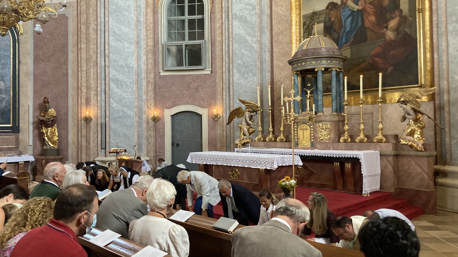 Den Mittelpunkt des Pfarrfestes am 26. Juni 2022 am Oberberg bildete der Gottesdienst, bei dem die Mitglieder von Pfarrgemeinderat und Wirtschaftsrat als Stärkung für die neue Amtsperiode von Pfarrer Alexander gesegnet wurden. Anschließend sangen alle gemeinsam "Gottes Liebe ist so wunderbar" und konnten sich mit den Bewegungen zu "So hoch – was kann höher sein? So tief – was kann tiefer sein? So weit – was kann weiter sein?" schon einmal für die nächste Pfarrgemeinderatssitzung aufwärmen.