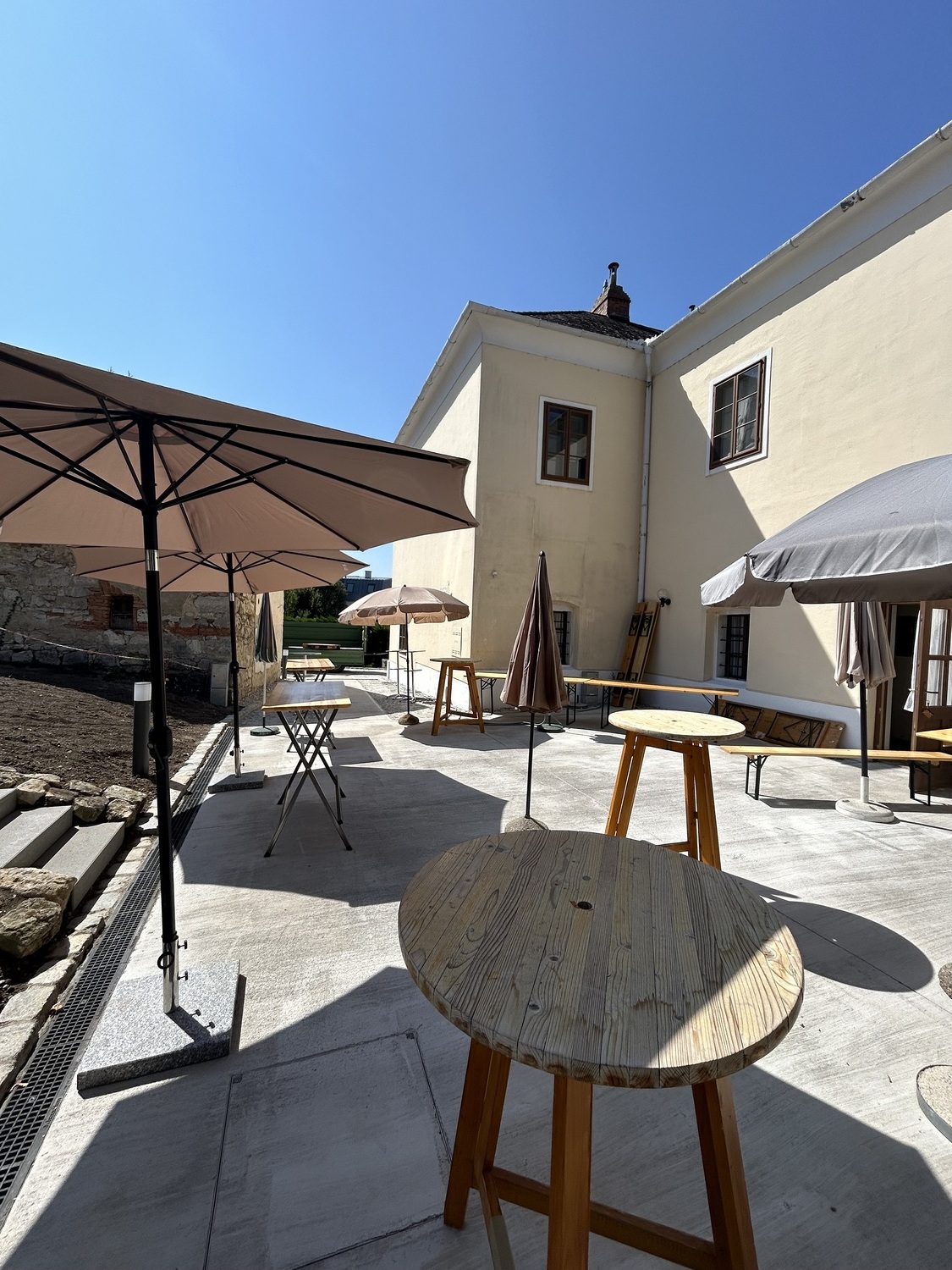 Die Stehtische und Sonnenschirme stehen bereit und die Getränke sind schon eingekühlt.