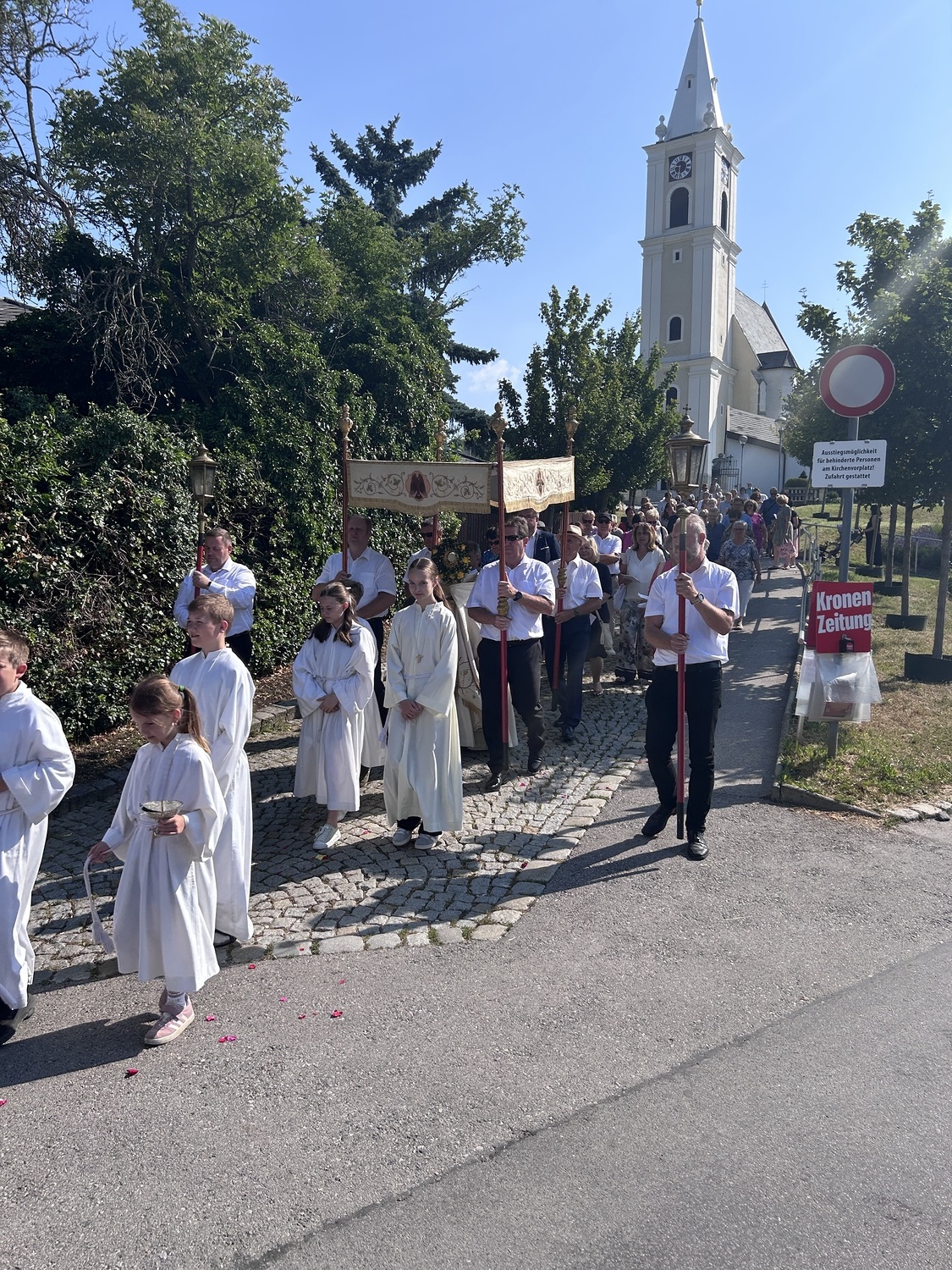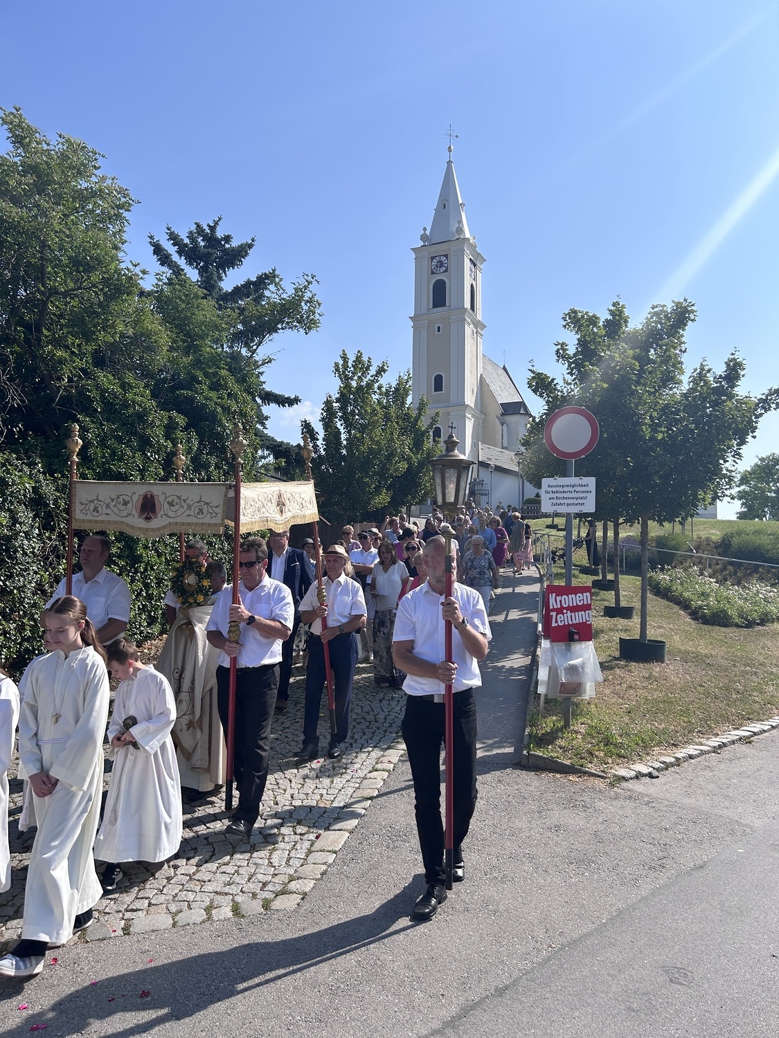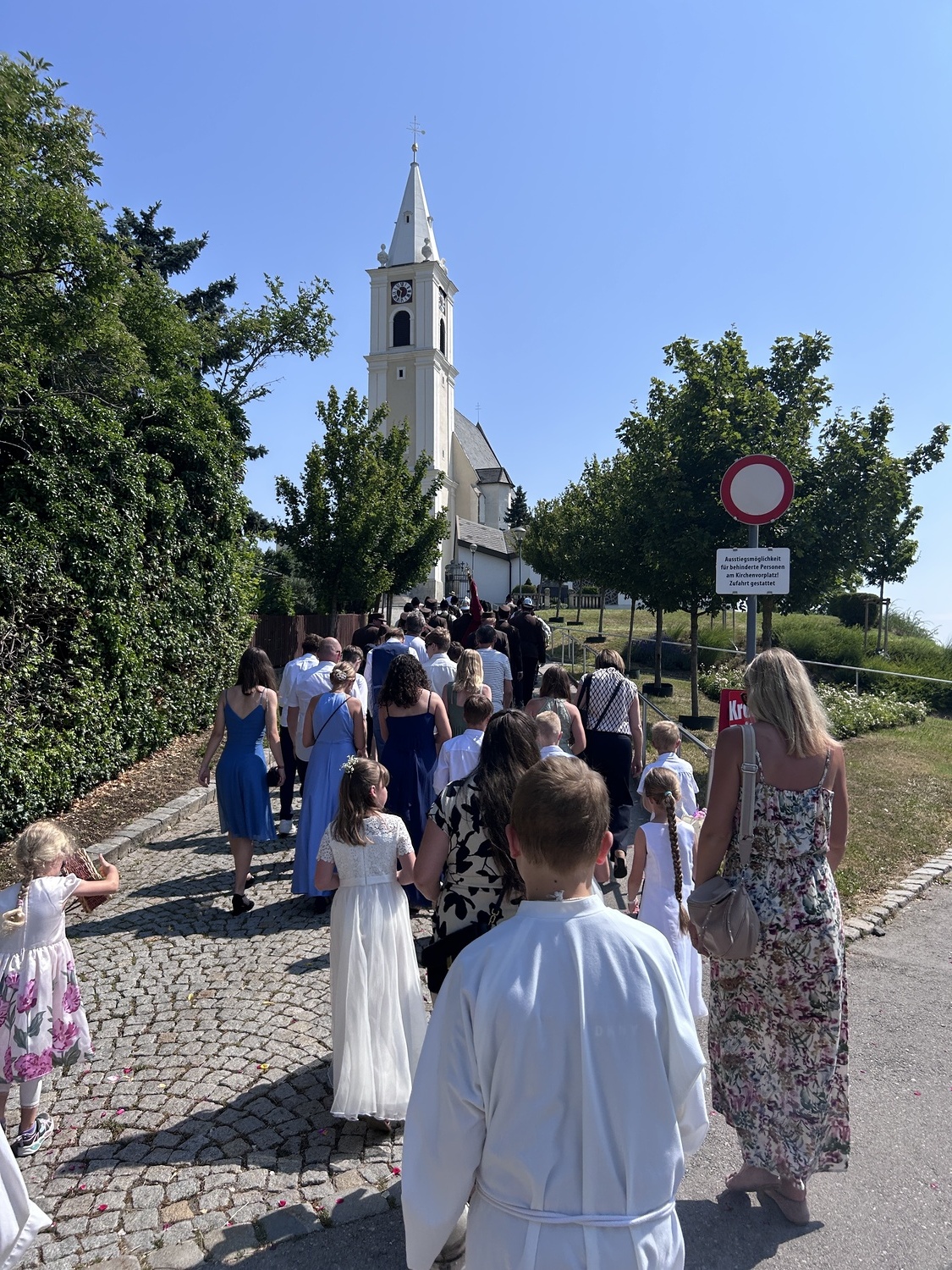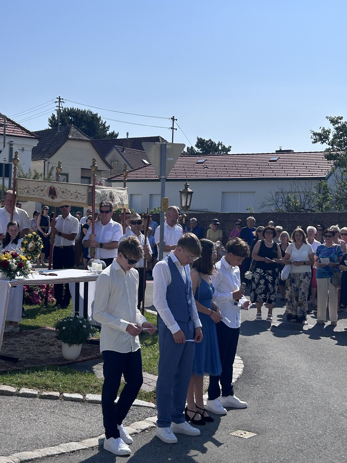 Nach der feierlichen Hl. Messe in der Pfarrkirche zog traditionell die Prozession durch unser Dorf – mit dabei das Allerheiligste, begleitet von unseren fleißigen Ministrant:innen, der Winzerkapelle, der Feuerwehr, den blumenstreuenden Erstkommunionkindern, den Neugefirmten, dem Pfarrgemeinderat, Vertretern der Stadt und vielen gläubigen Kleinhöfleinerinnen und Kleinhöfleinern.