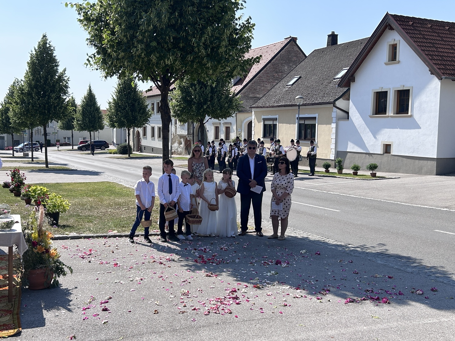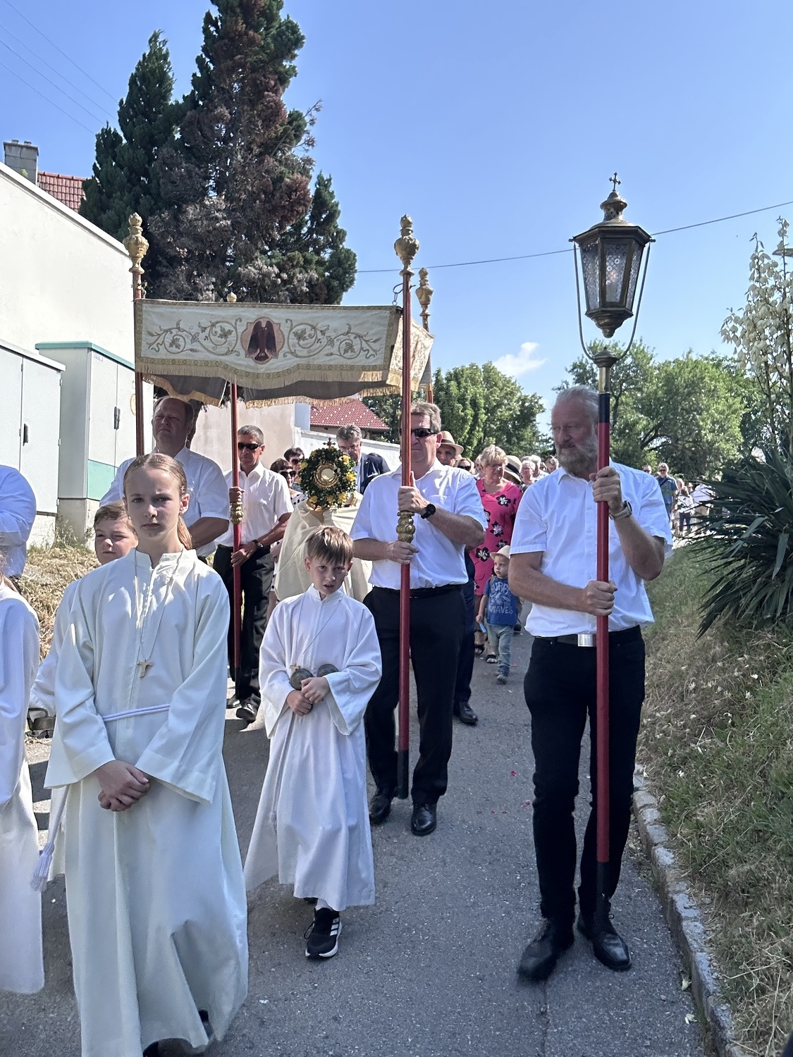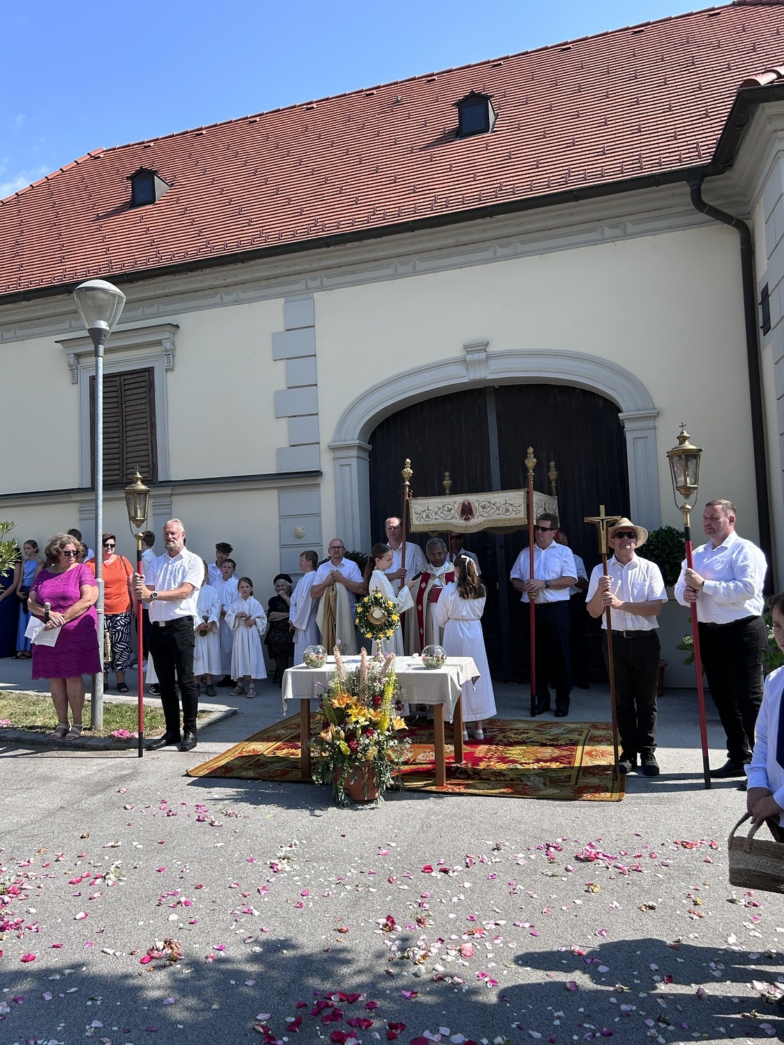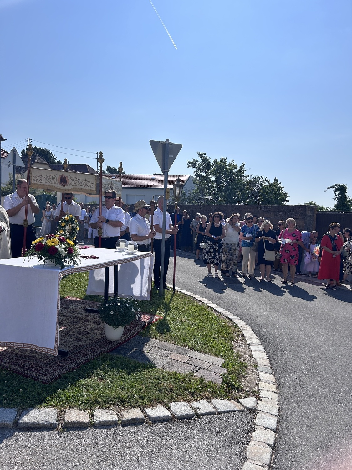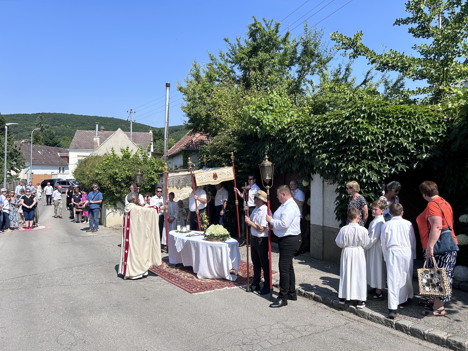 Nach der feierlichen Hl. Messe in der Pfarrkirche zog traditionell die Prozession durch unser Dorf – mit dabei das Allerheiligste, begleitet von unseren fleißigen Ministrant:innen, der Winzerkapelle, der Feuerwehr, den blumenstreuenden Erstkommunionkindern, den Neugefirmten, dem Pfarrgemeinderat, Vertretern der Stadt und vielen gläubigen Kleinhöfleinerinnen und Kleinhöfleinern.