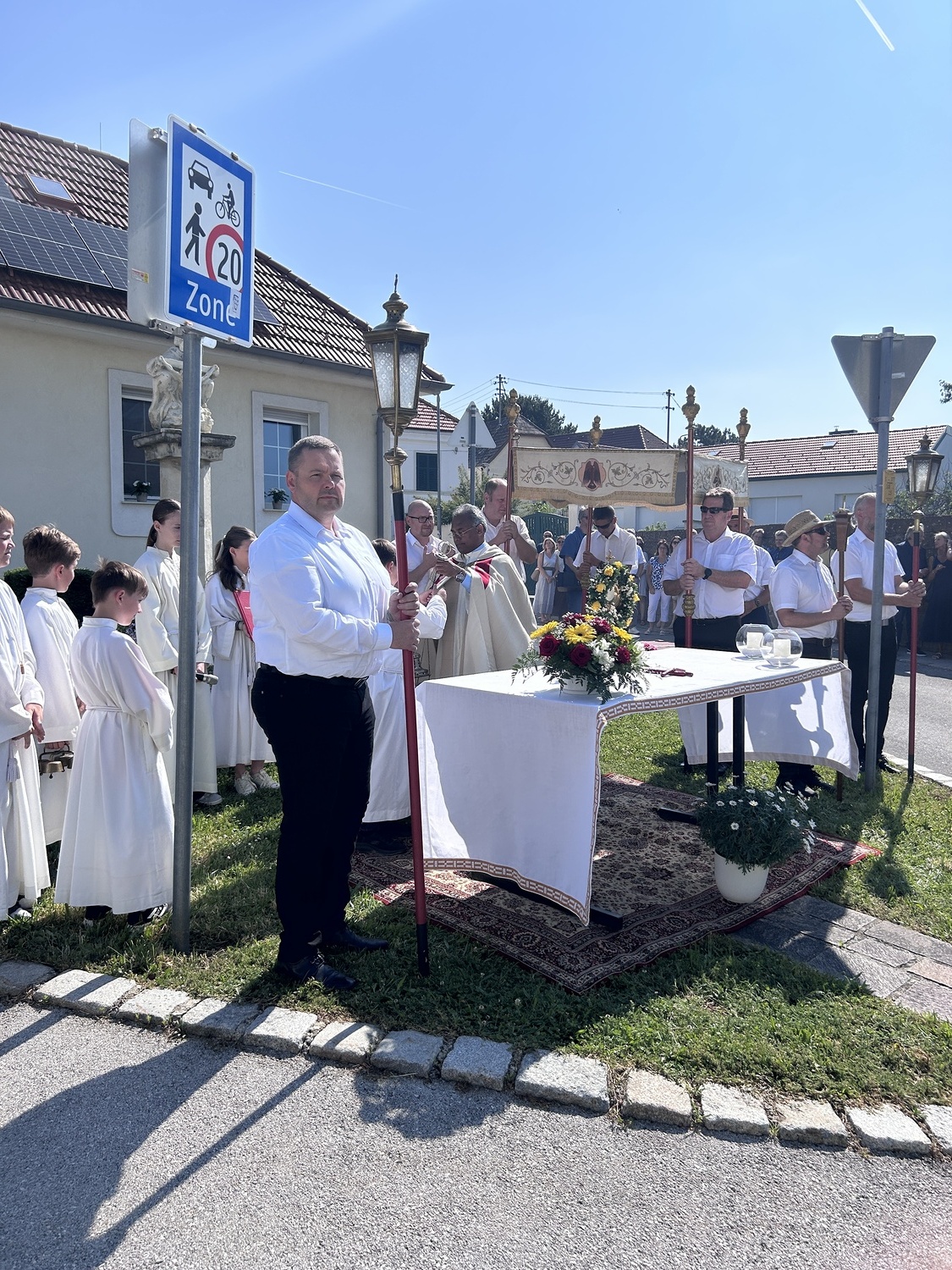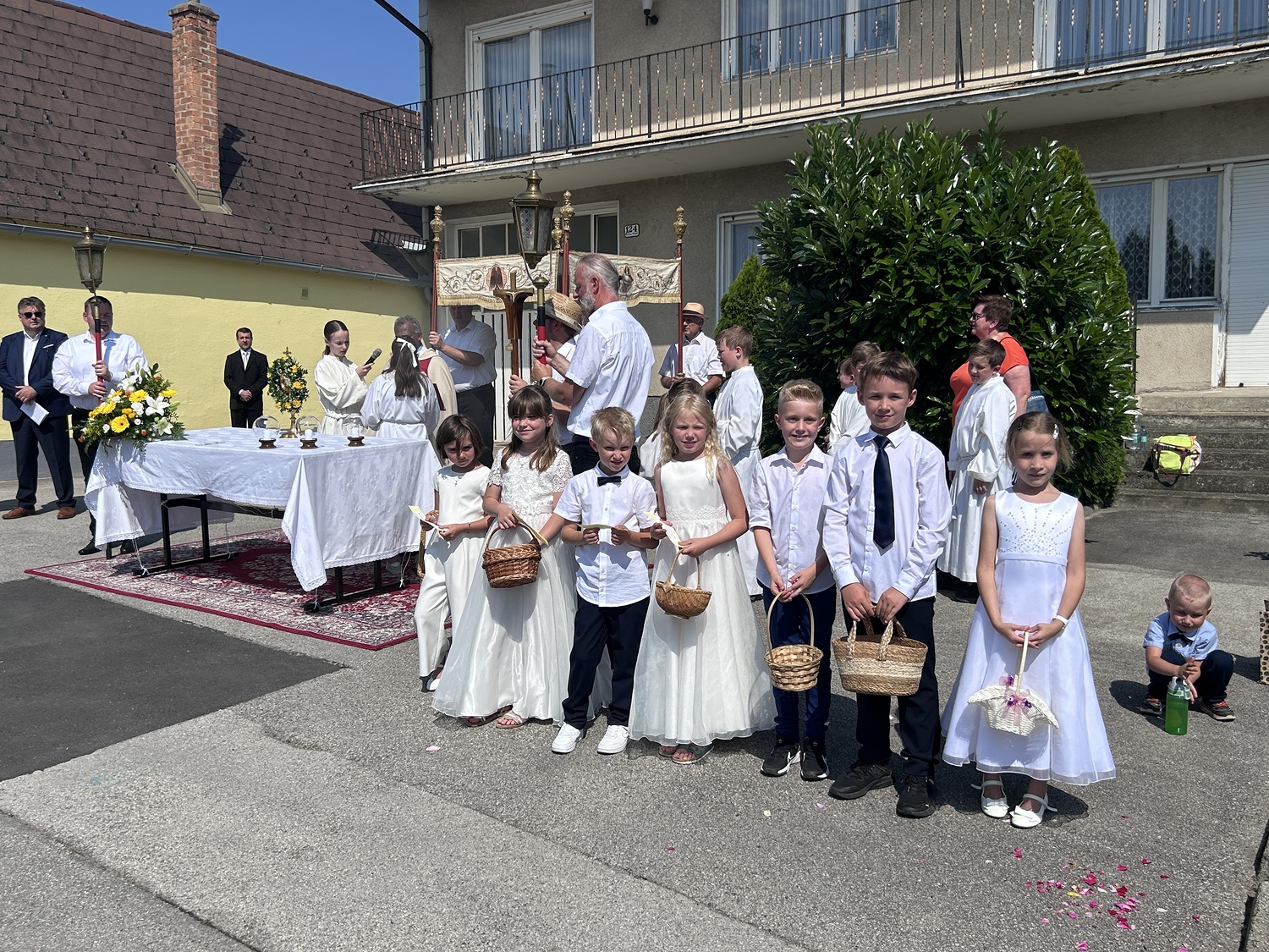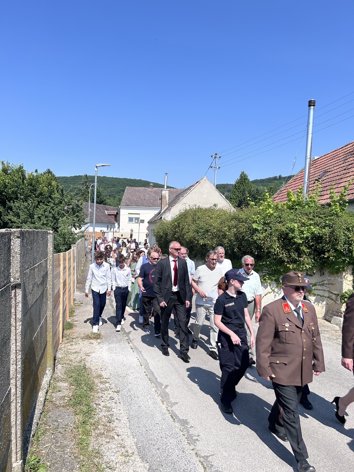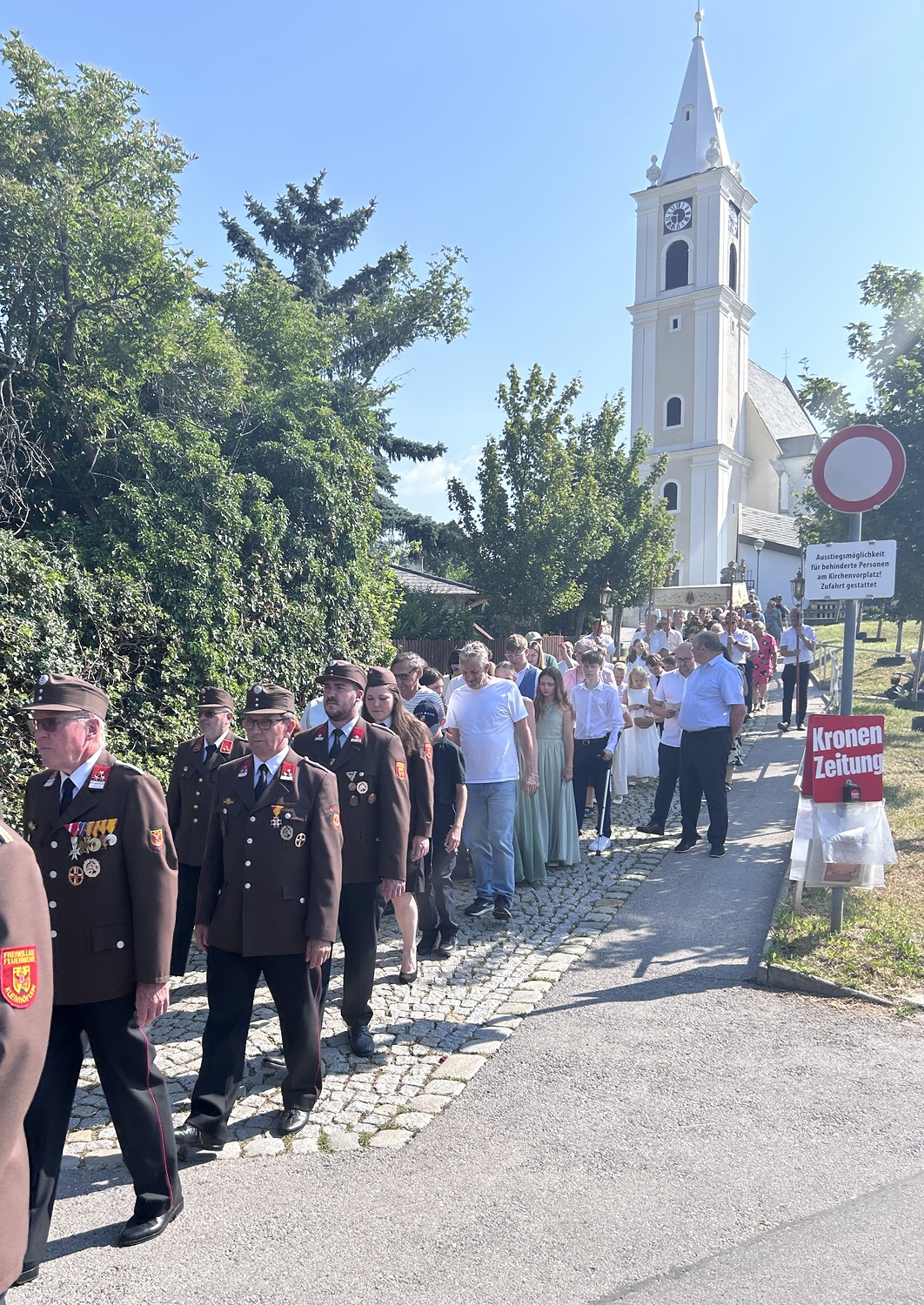 Nach der feierlichen Hl. Messe in der Pfarrkirche zog traditionell die Prozession durch unser Dorf – mit dabei das Allerheiligste, begleitet von unseren fleißigen Ministrant:innen, der Winzerkapelle, der Feuerwehr, den blumenstreuenden Erstkommunionkindern, den Neugefirmten, dem Pfarrgemeinderat, Vertretern der Stadt und vielen gläubigen Kleinhöfleinerinnen und Kleinhöfleinern.