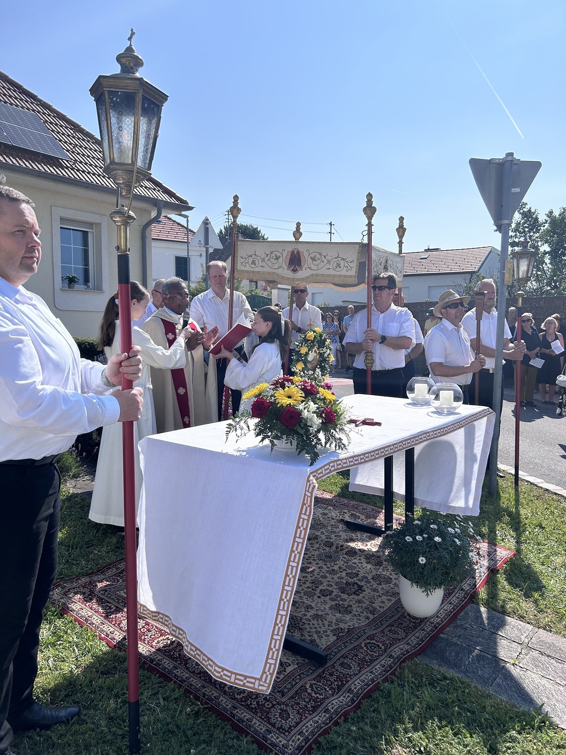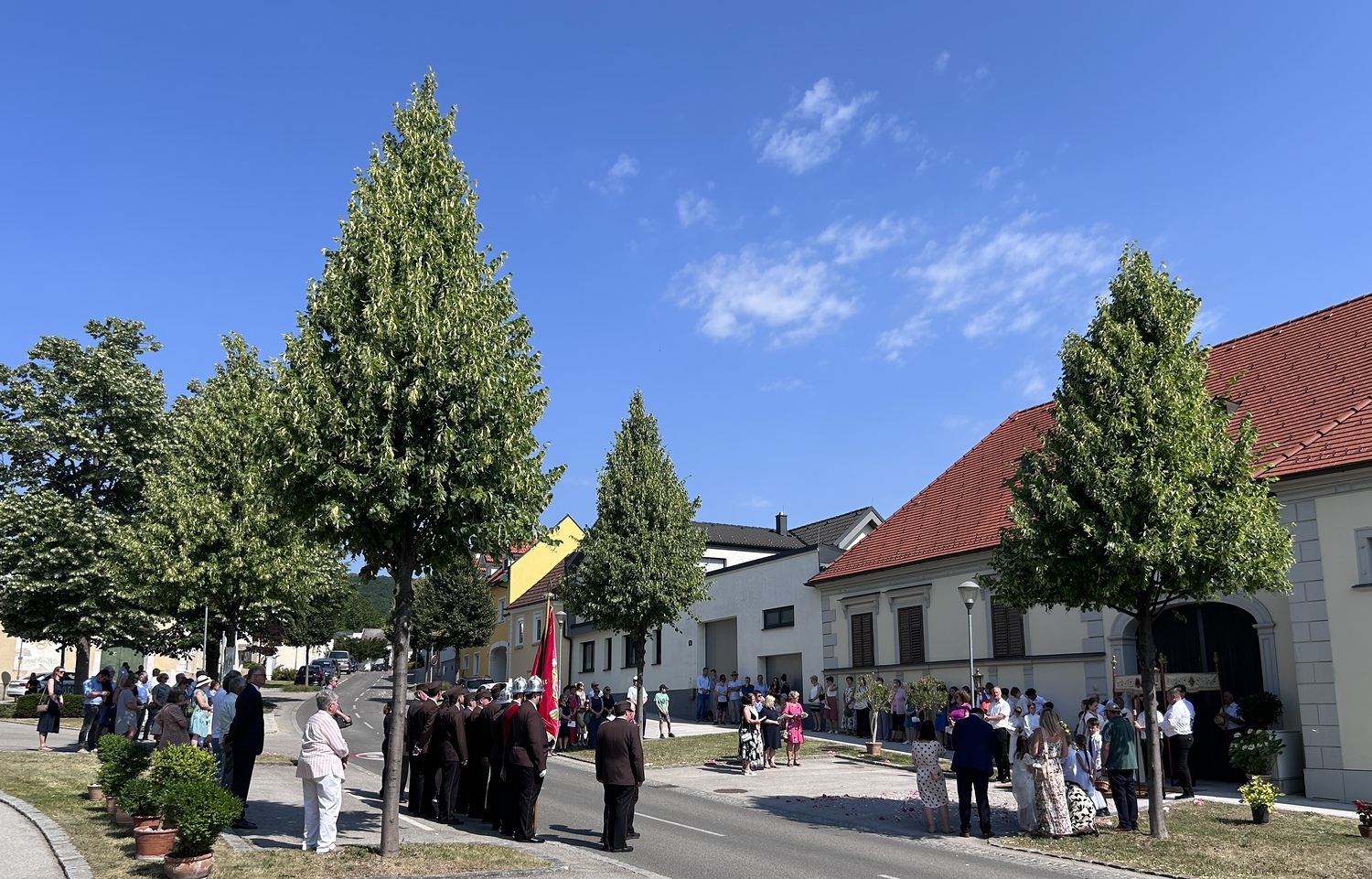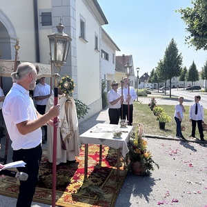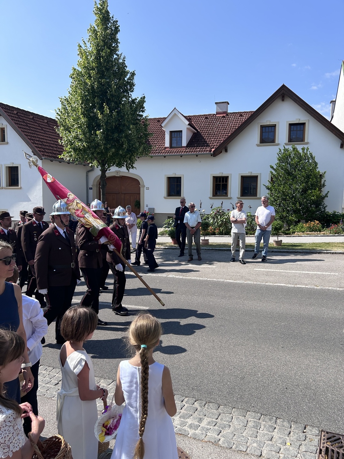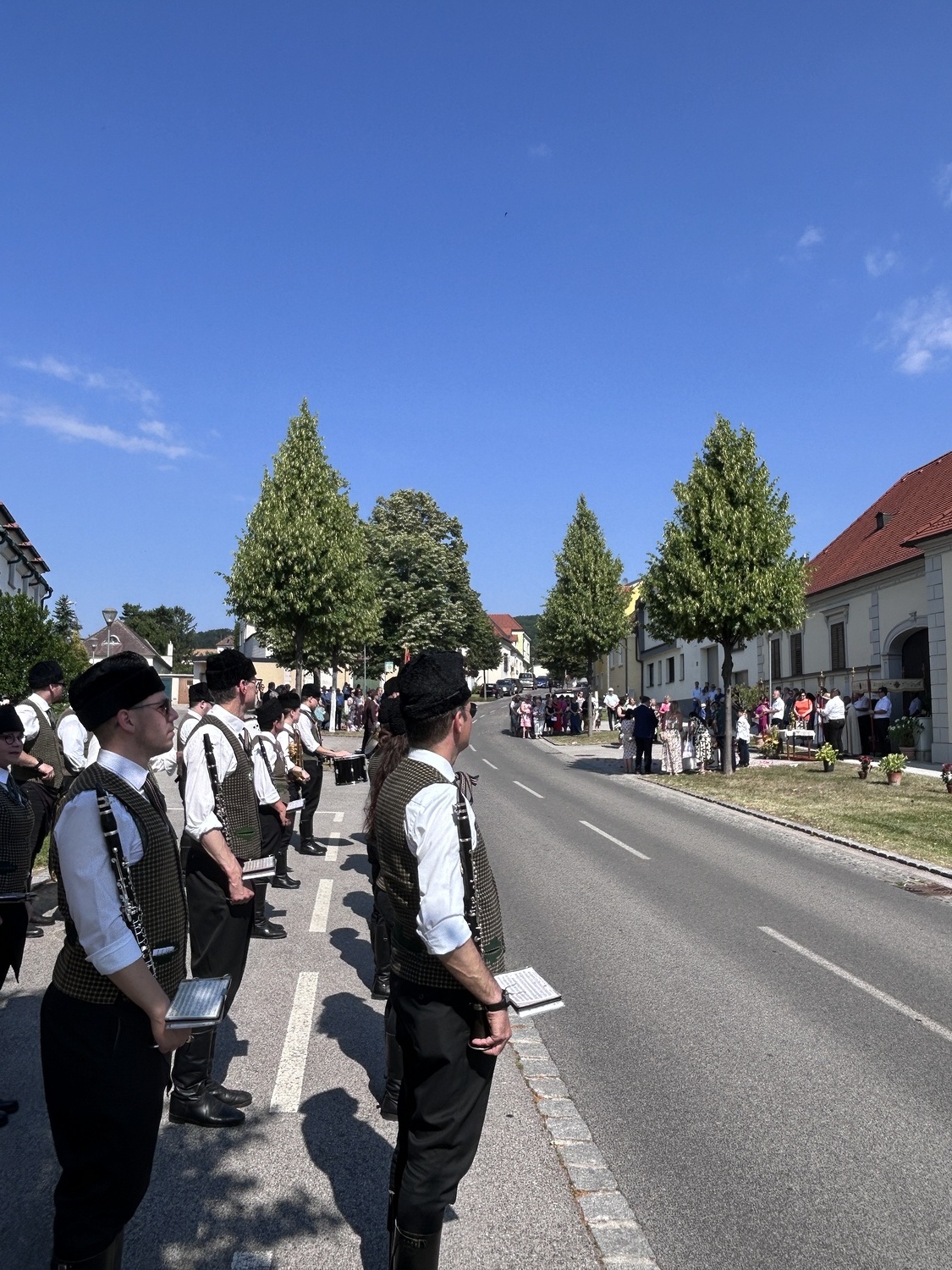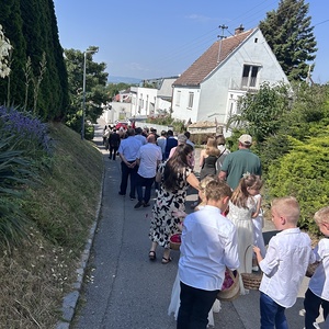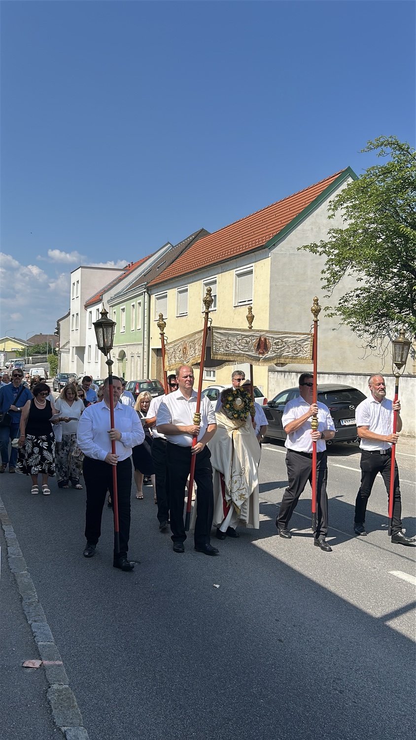 Nach der feierlichen Hl. Messe in der Pfarrkirche zog traditionell die Prozession durch unser Dorf – mit dabei das Allerheiligste, begleitet von unseren fleißigen Ministrant:innen, der Winzerkapelle, der Feuerwehr, den blumenstreuenden Erstkommunionkindern, den Neugefirmten, dem Pfarrgemeinderat, Vertretern der Stadt und vielen gläubigen Kleinhöfleinerinnen und Kleinhöfleinern.