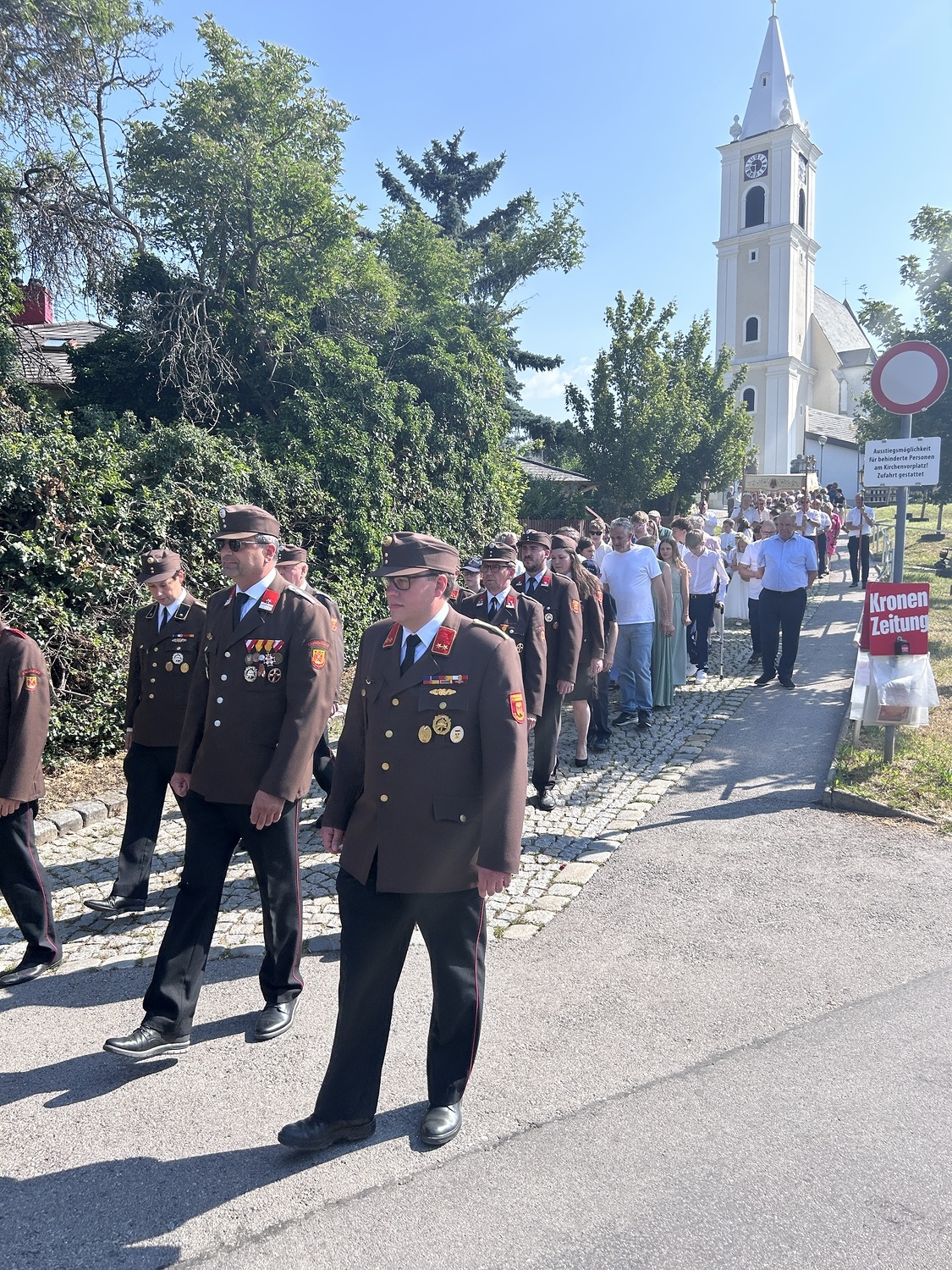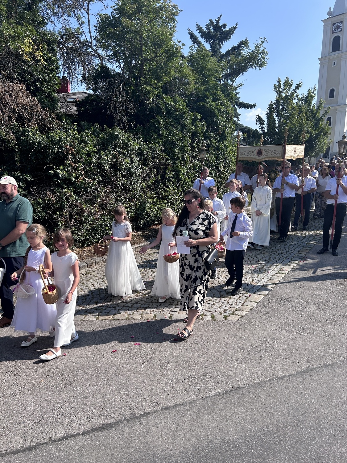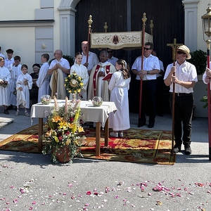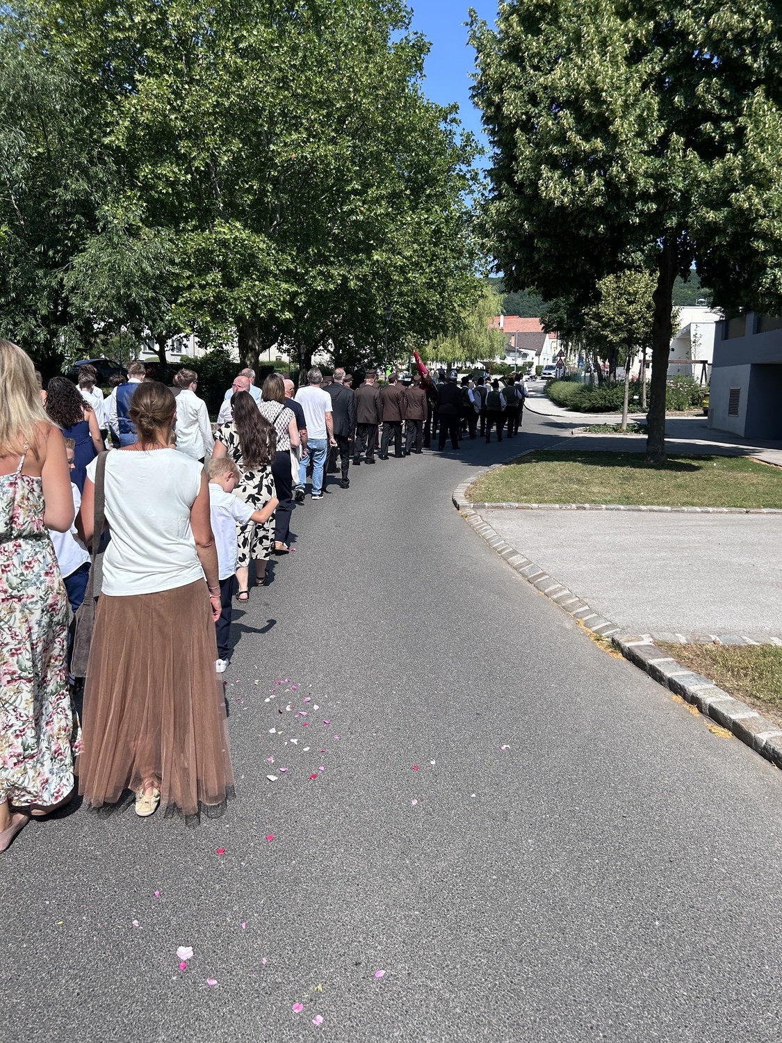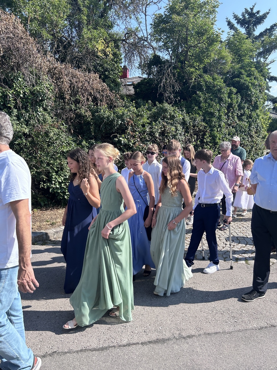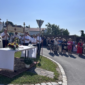 Nach der feierlichen Hl. Messe in der Pfarrkirche zog traditionell die Prozession durch unser Dorf – mit dabei das Allerheiligste, begleitet von unseren fleißigen Ministrant:innen, der Winzerkapelle, der Feuerwehr, den blumenstreuenden Erstkommunionkindern, den Neugefirmten, dem Pfarrgemeinderat, Vertretern der Stadt und vielen gläubigen Kleinhöfleinerinnen und Kleinhöfleinern.