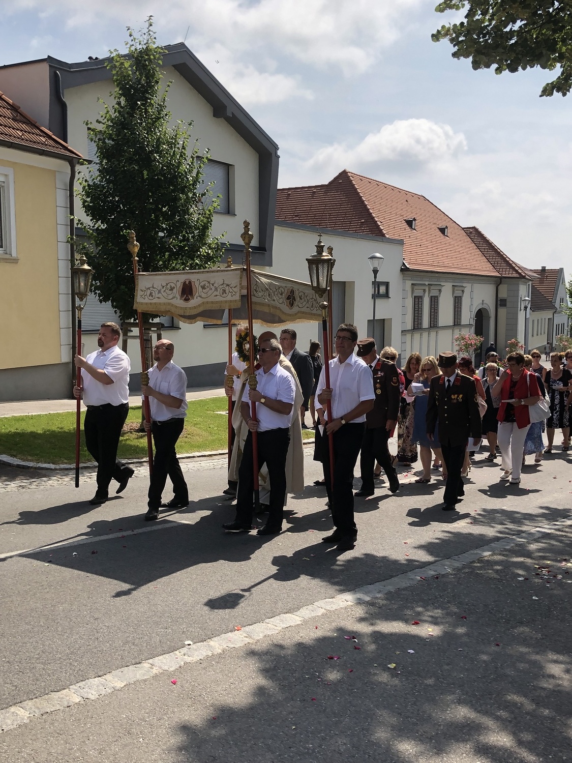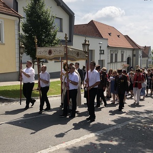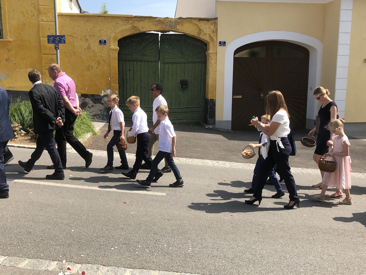Zu Fronleichnam bezeugen wir unseren Glauben and die leibliche Gegenwart Jesu Christi im Saktrement der Eucharistie. Der Name des Festes leitet sich aus dem Mittelhochdeutschen "vrone licham" - Leib des Herren ab. Das Brauchtum der Fromleichnamsprozession, bei der der Leib Christi in einer Monstranz durch die Straßen getragen wird, stammt aus dem Mittelalter. Dabei werden auch der Flurschutz, Feldweihen und Wetterbitten dargebracht. Bei der Prozession nahmen traditionell Feuerwehr und Musikverein, sowie die Erstkommunionskinder und viele Gläubige teil.