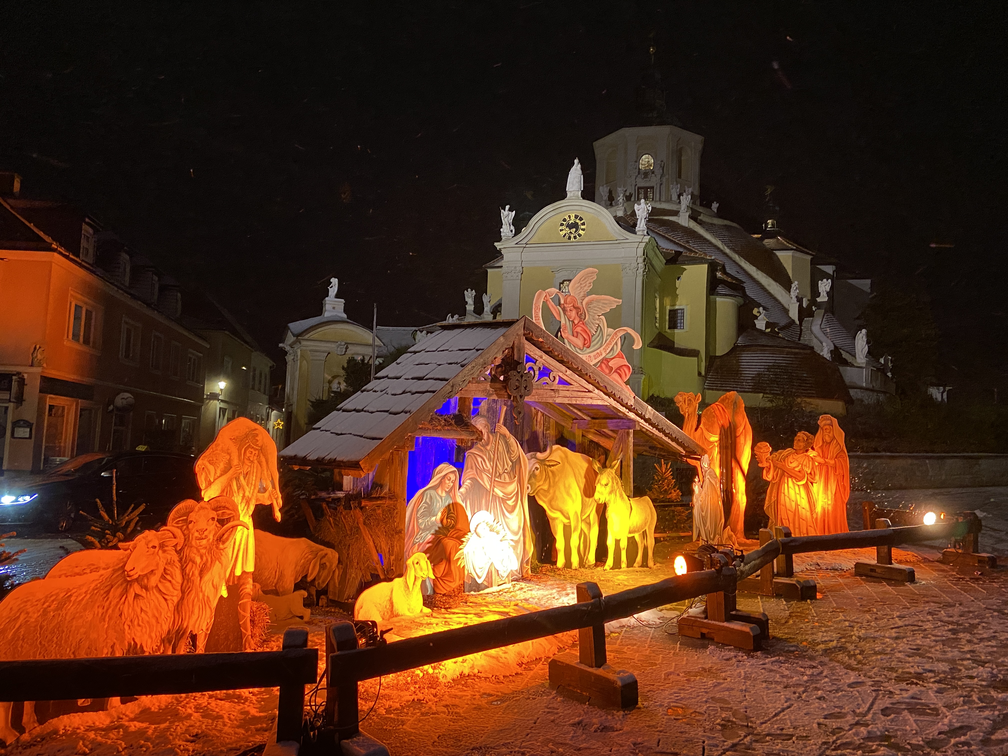 Ein Highlight in der weihnachtlichen Dekoration von Eisenstadt ist die lebensgroße Krippe auf dem Kalvarienbergplatz. Auf rund 60 m² wurde mit lebensgroßen Figuren der Stall von Bethlehem mit Maria und Josef, dem Jesukind und den Heiligen Drei Königen aufgebaut. Die perfekte Kulisse dazu, bildet die Bergkirche. „Mir war es wichtig, dass wir auch den Oberberg und die malerische Kulisse der Bergkirche in unsere weihnachtliche Dekoration noch mehr einbeziehen“, so Bürgermeister Steiner.