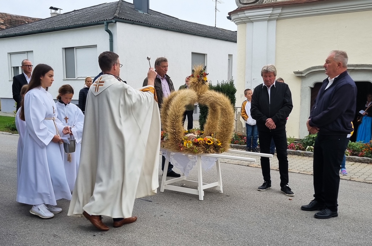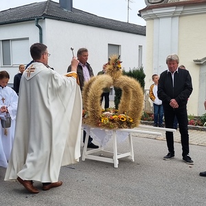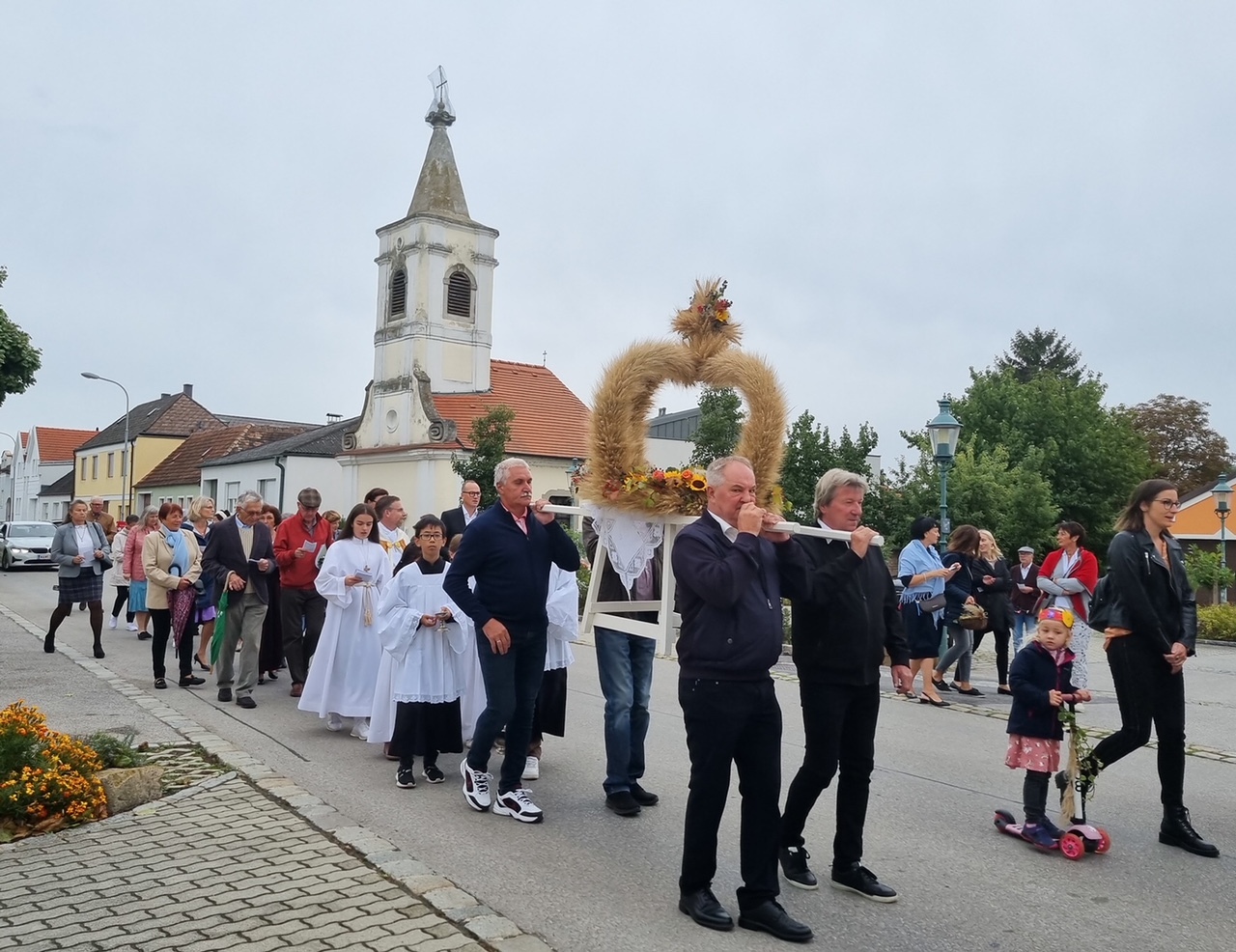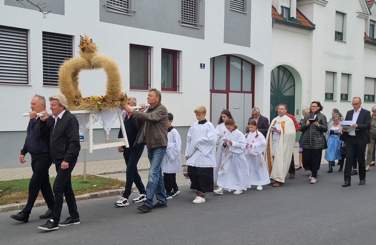 Die Pfarre feierte am Sonntag, 24. September 2023, das Erntedankfest. Um 9.45 Uhr wurde die Erntekrone bei der Marienkapelle feierlich gesegnet, dann ging es in einer Prozession zur Kirche. Anschließend feierte Pfarrmoderator Mag. Stefan Jahns die hl. Messe.