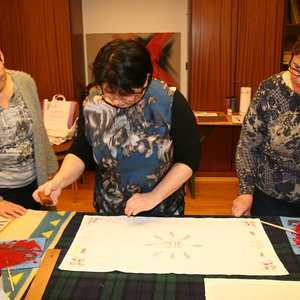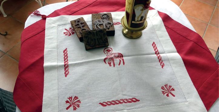 Danach gestalten die Frauen mit Hertha Decker ein Stoffdruckdeckerl. Es entstanden mit viel Freude und Einsatz Weihedeckerl für die Segnung der Osterspeisen aber auch individuell gestaltete Stoffdruckdeckerl.