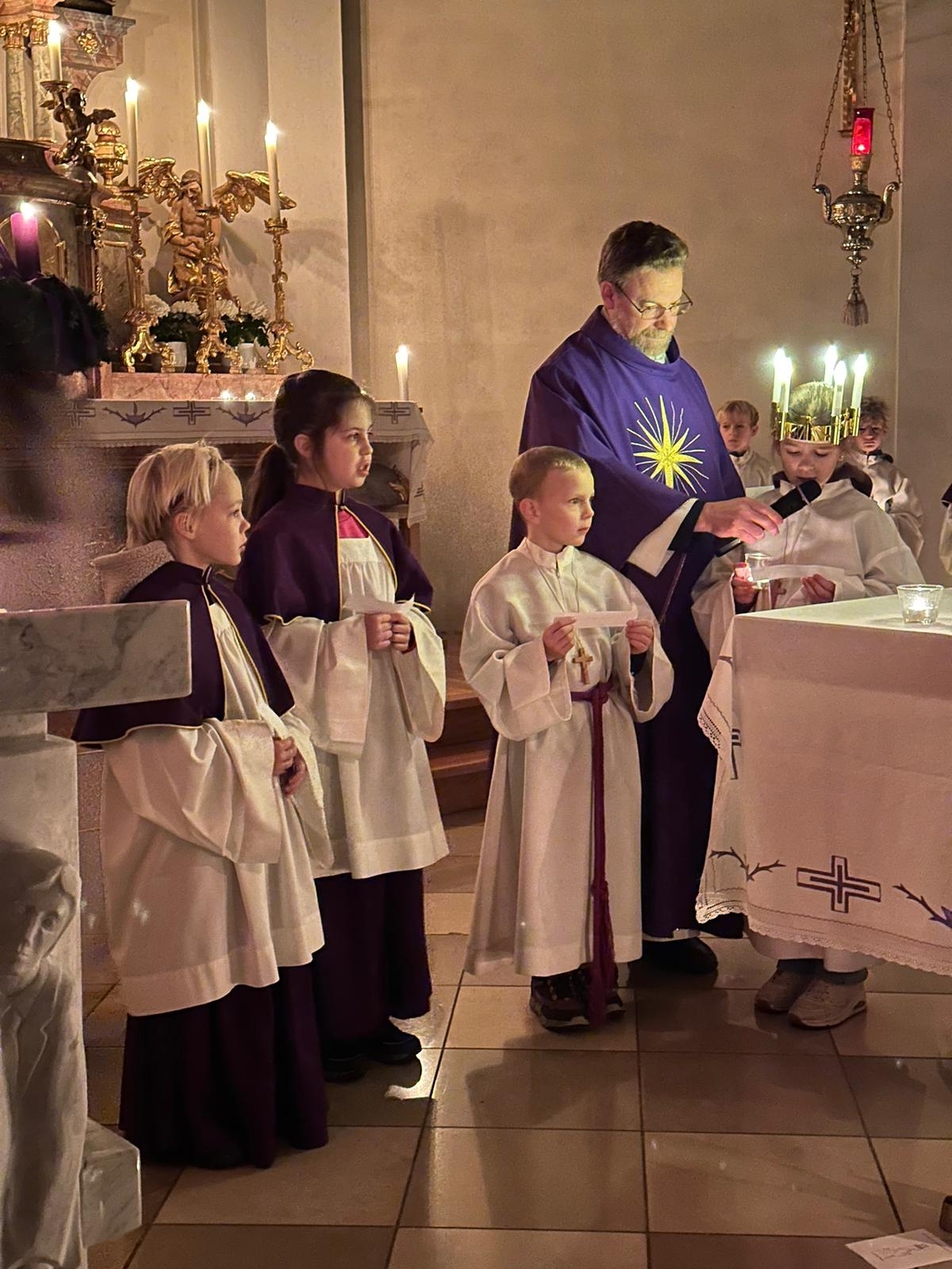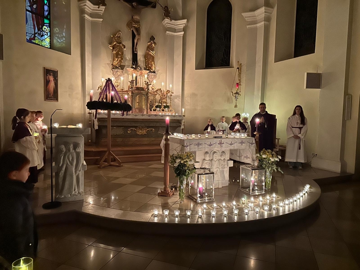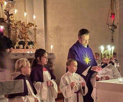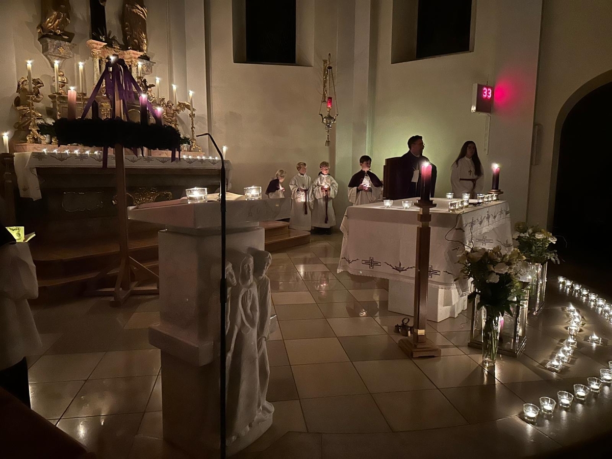 Im Gedenken an die hl. Lucia feierte Pfarrmoderator Mag. Stefan Jahns die Roratemesse am Montag, 15.12.2025. Zur Mitfeier waren besonders Schüler und Jugendliche eingeladen. Viele mitgebrachte Kerzen erleuchteten die Kirche und so wurde die Messe ohne elektrische Beleuchtung gefeiert.