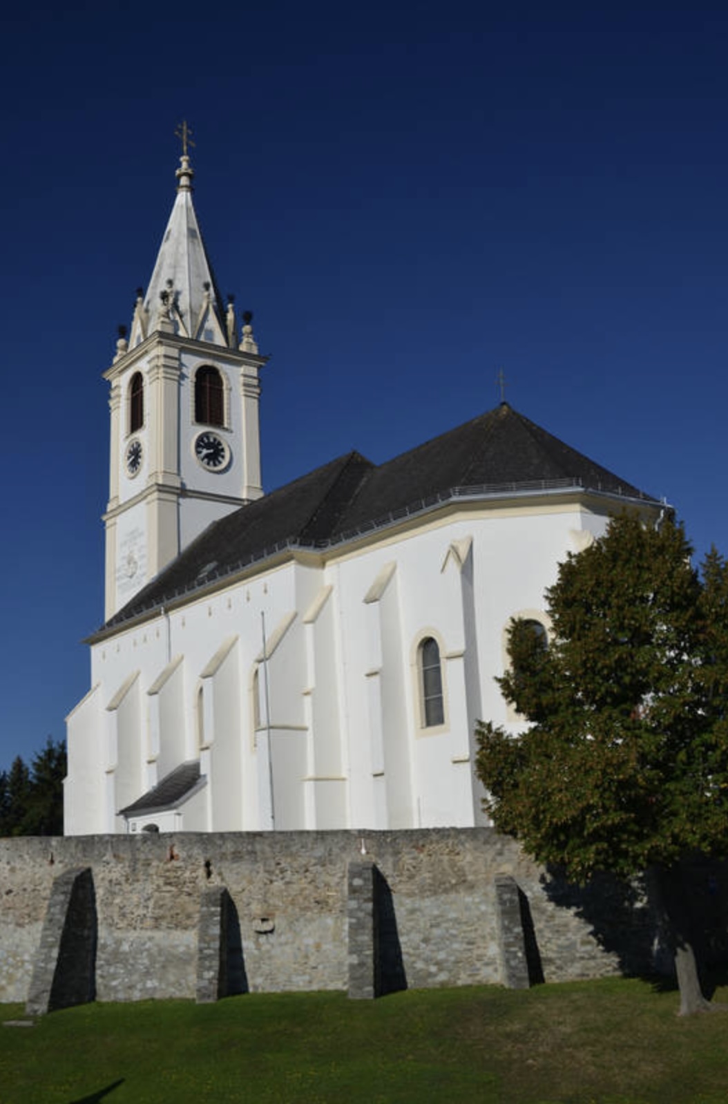 Auf einer Anhöhe oberhalb des Ambrosius Salzer-Platzes steht der einschiffige, ursprünglich gotische Bau im Kirchhof, der von einer mittelalterlichen Wehrmauer eingefasst ist.