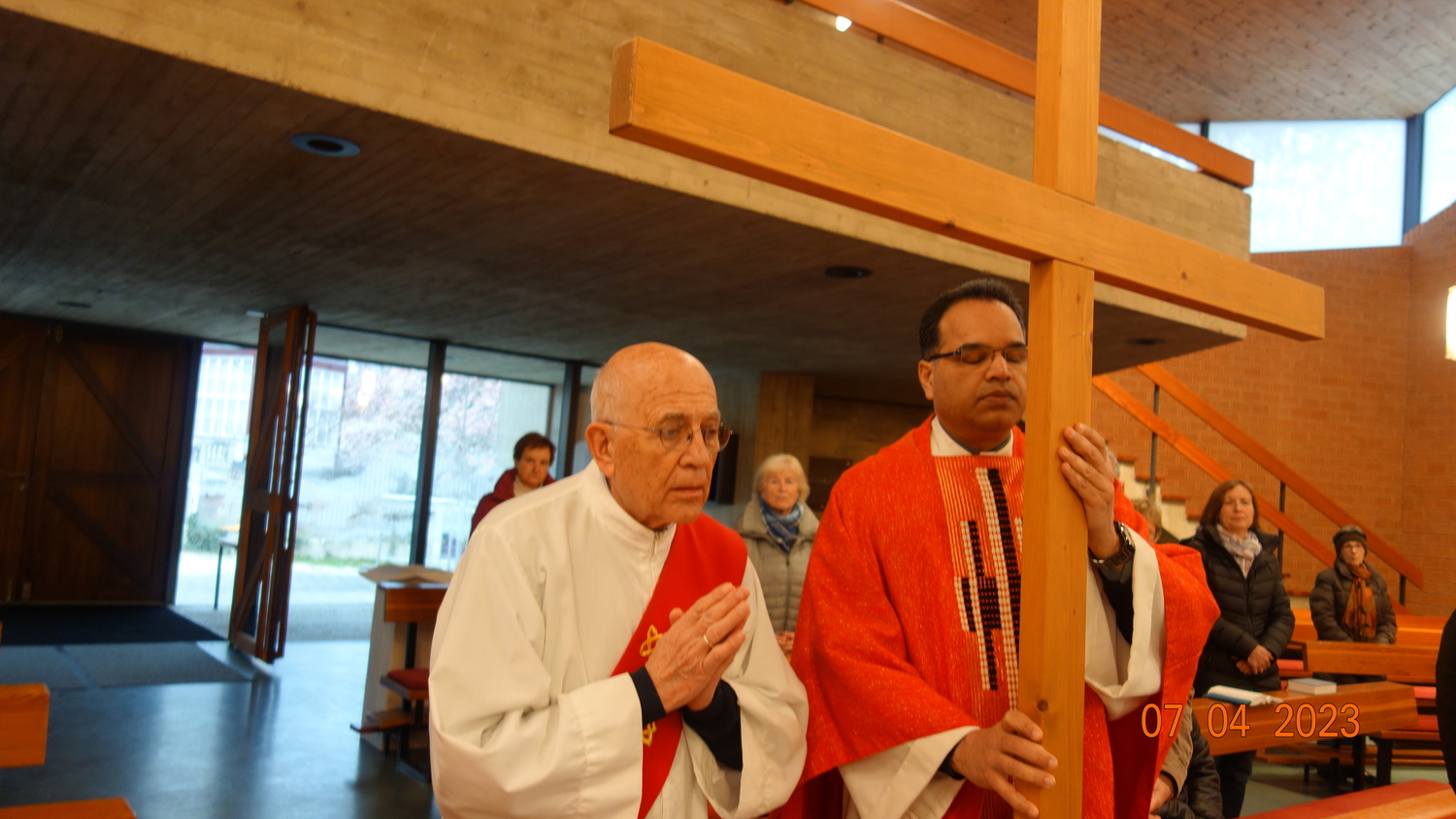 Um 1500 Uhr am Karfreitag, dem 7. April 2023 fand in der Pfarrkirche ein Kreuzweg unter Leitung von Diakon Dr. Peter Zotti statt. Dabei präsentierte Dr. Peter Zotti auch das Misereor Hungertuch. Dann wurden die Gläubigen durch die 14 allgemein bekannten Stationen des Kreuzweges geführt.