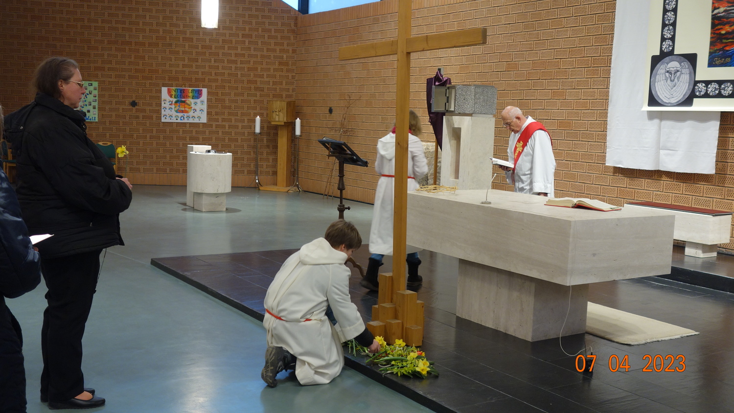 Am Ende der Andacht fand die Kreuzverehrung statt, bei der die Gläubigen eine mitgebrachte Blume am Fuß des Kreuzes darbrachten. Am Karsamstag wird eine Laudes beim Heiligen Grab stattfinden.