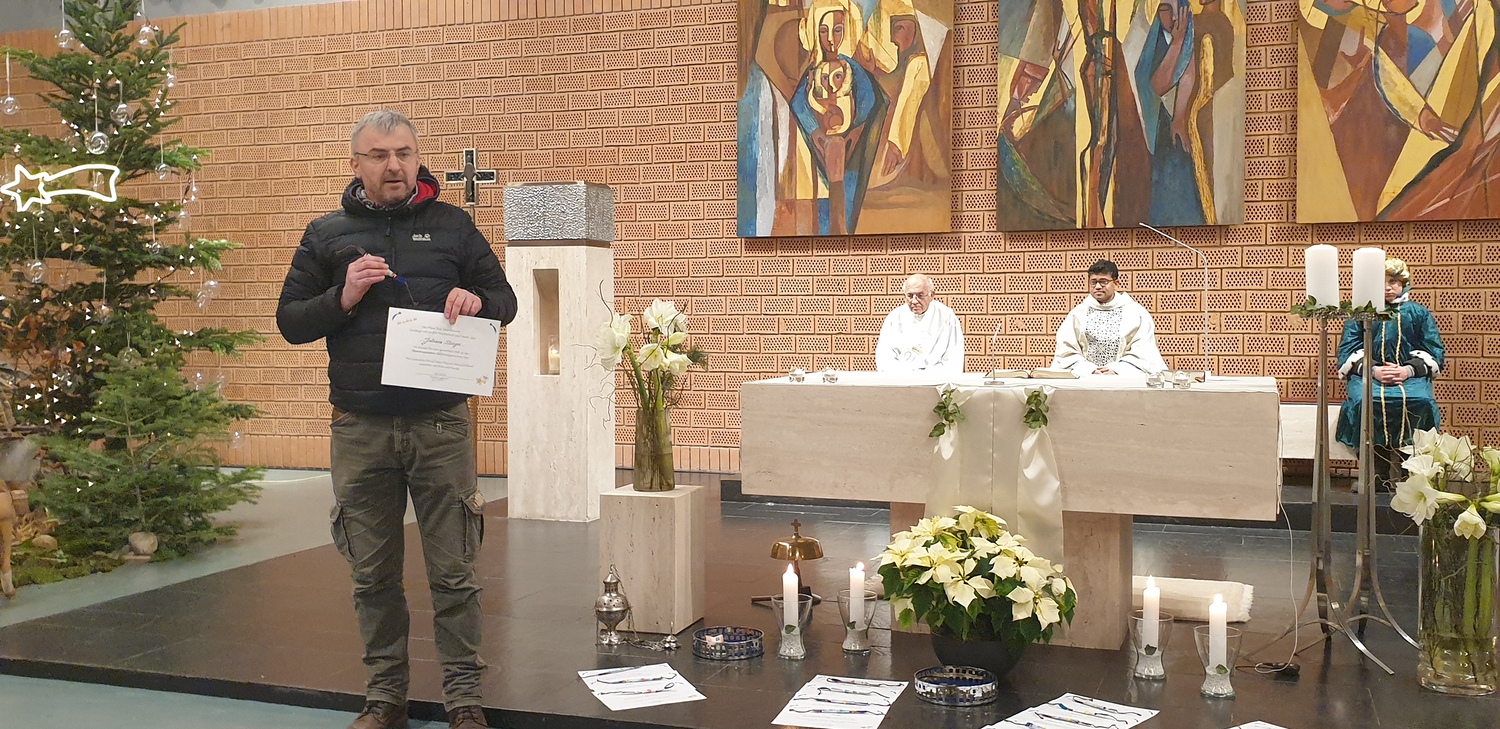 Am 7. Jänner 1800 Uhr kehrten die Sternsinger in die Kirche zurück und die Pfarrgemeinde feierte die Messe mit ihnen, wo die Sternsinger noch einmal die frohe Botschaft verkündigten. Zum Schluß bedankten sich Pater Rijo und Diakon Dr. Peter Zotti ganz herzlich bei den Sternsingern und lobten ihr Engagement. Organisator der Sternsingeraktion und Pfarrgemeinderat Andi Reisner übergab dann noch Erinnerungurkunden an die Sternsinger und deren Begleitpersonen.