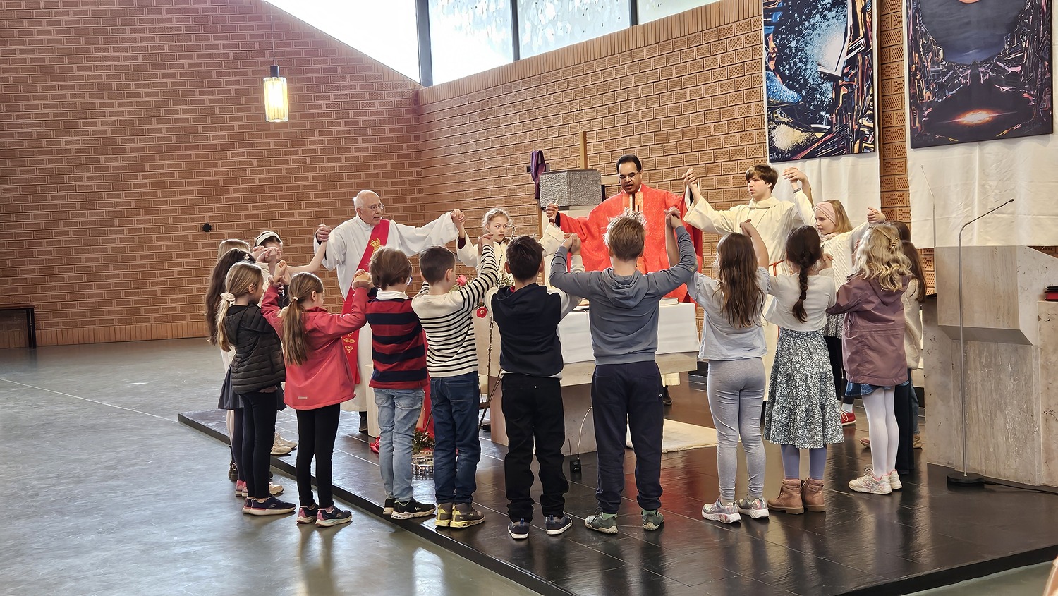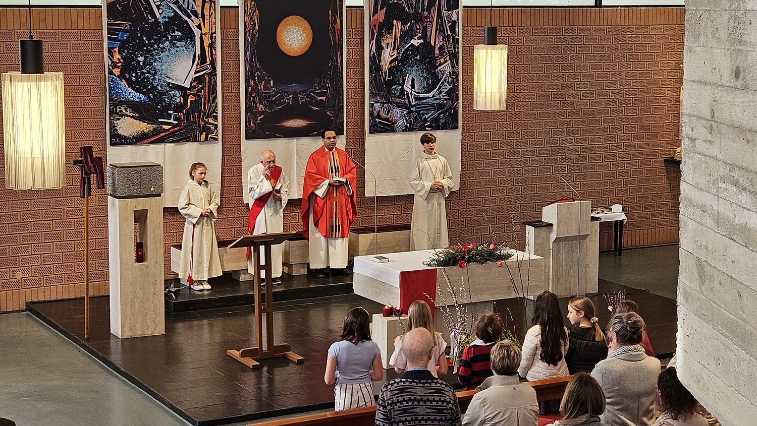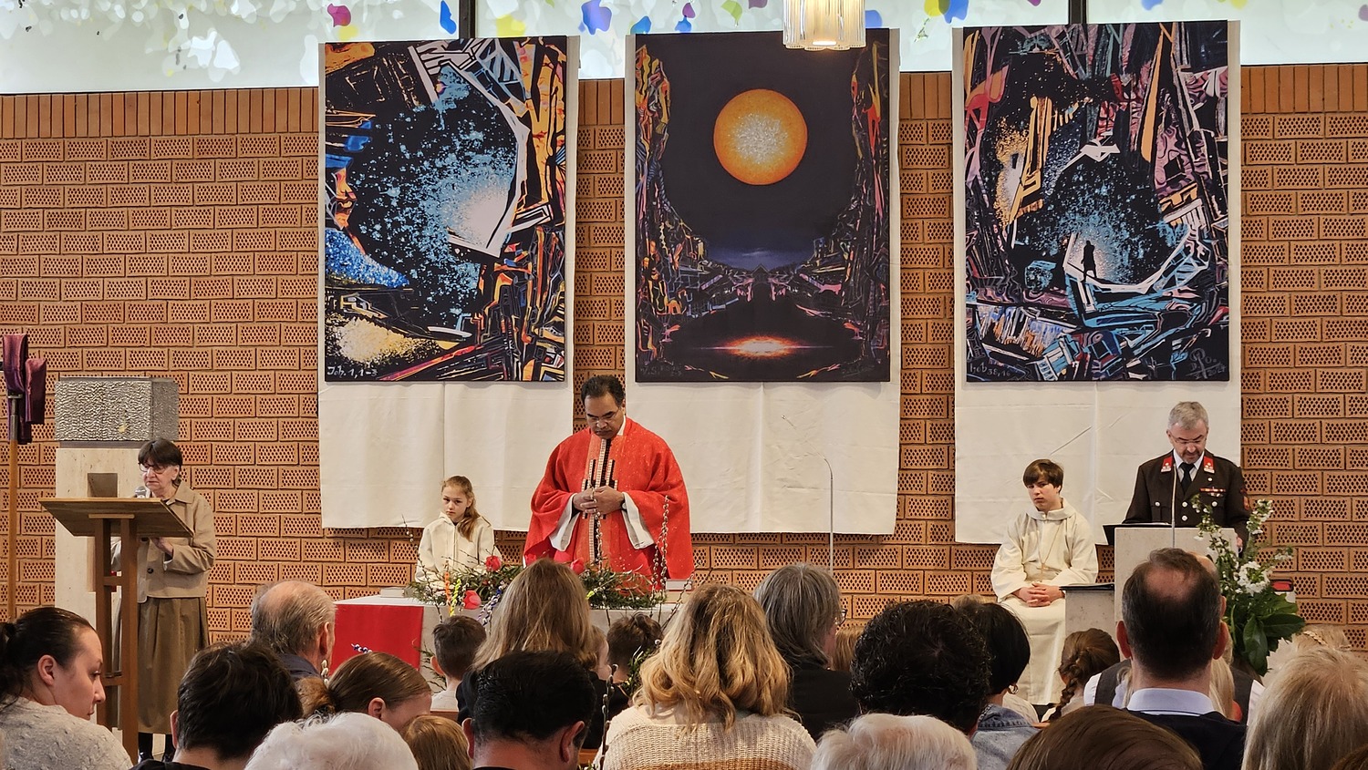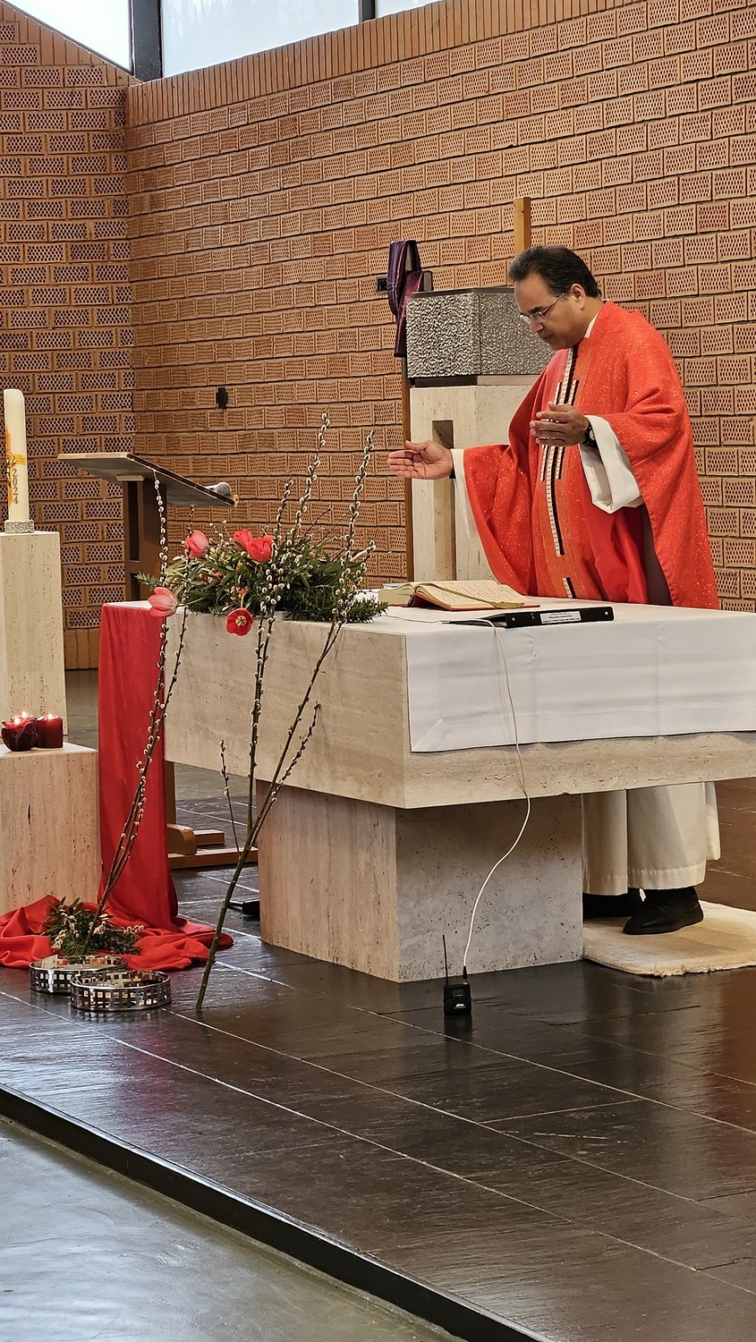 Mit einem großen Einzug in die Pfarrkirche endete die Palmprozession. Während der Hl. Messe, nach den Lesungen, wurde die Leidensgeschichte unseres Herrn Jesus Christus vorgetragen. Die Texte des Evangelisten wurden von Pfarrgemeinderat Andreas Reisner verlesen, die Texte von Anderen wurden von Pfarrkuratorin Gerti Ankerl vorgetragen, die Worte von Jesus sprach Pater Kuruvila.