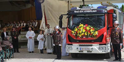Das 140jährige Bestandsjubiläum und die Segnung eines neuen Löschfahrzeuges waren Grund, dass die Hl. Messe am 5. Mai 2024 im Bad Sauerbrunner Kurpark stattfand.