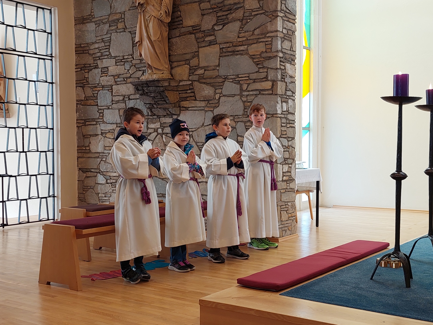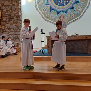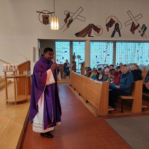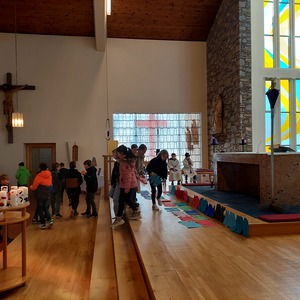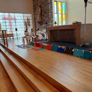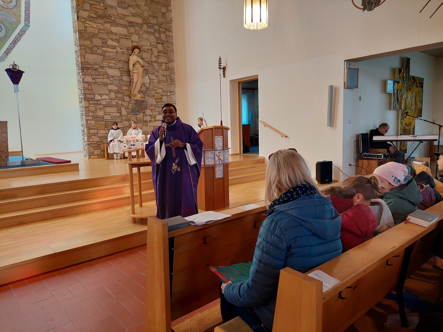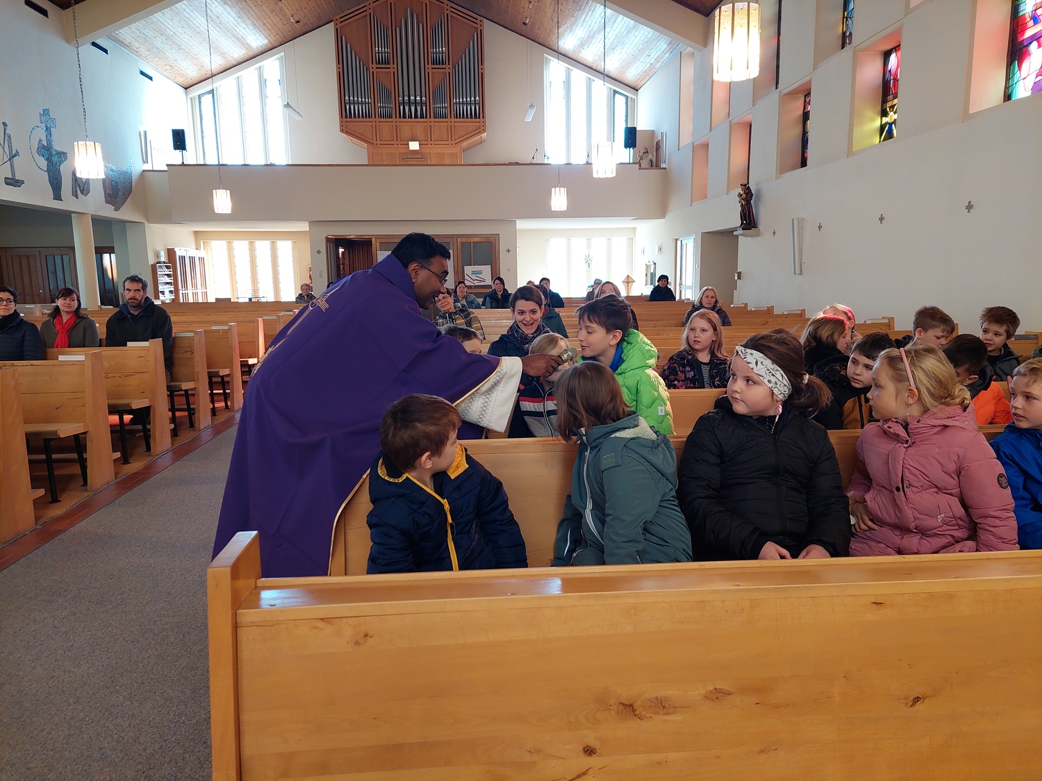 Die Schülerinnen und Schüler der Volksschule feierten gemeinsam mit P. Jomon, dem Lehrkörper und einigen Eltern sowie Großeltern einen feierlichen Ostergottesdienst.