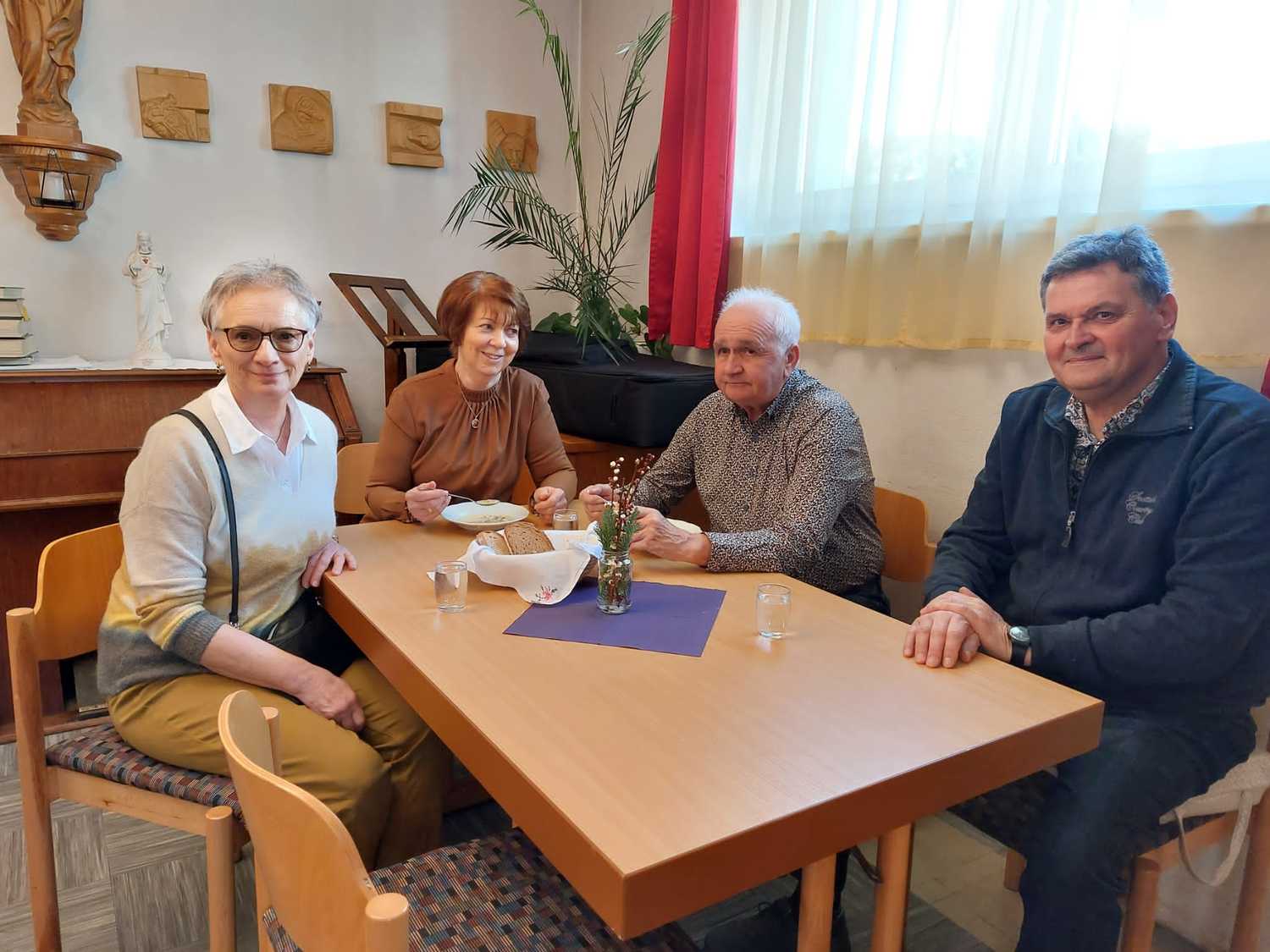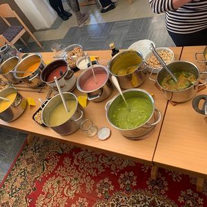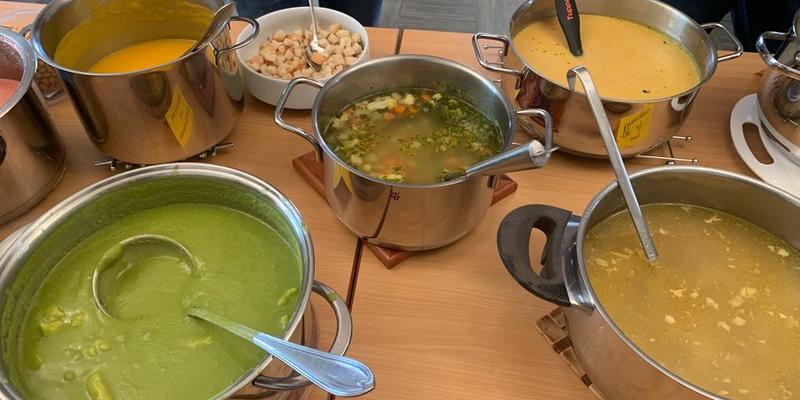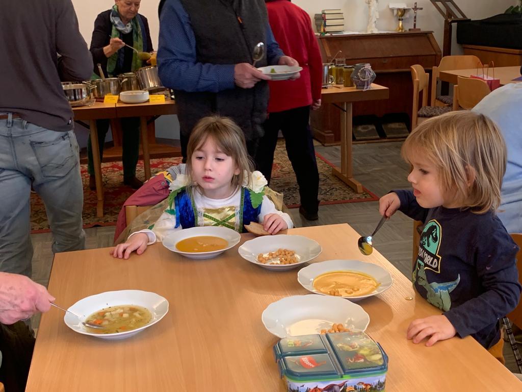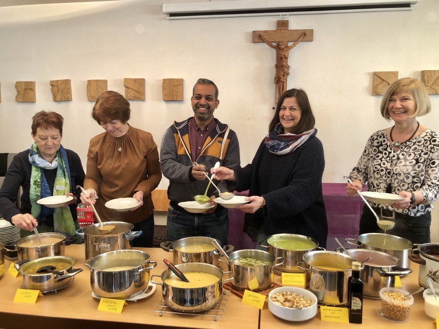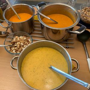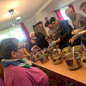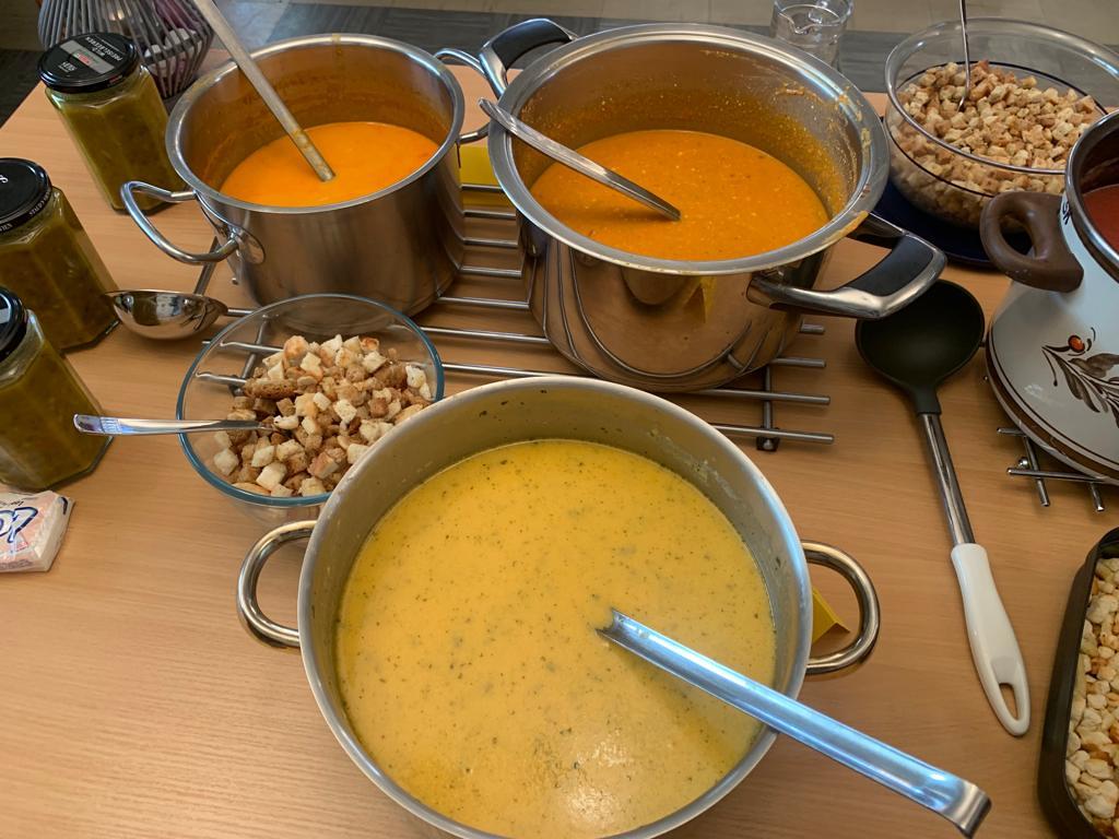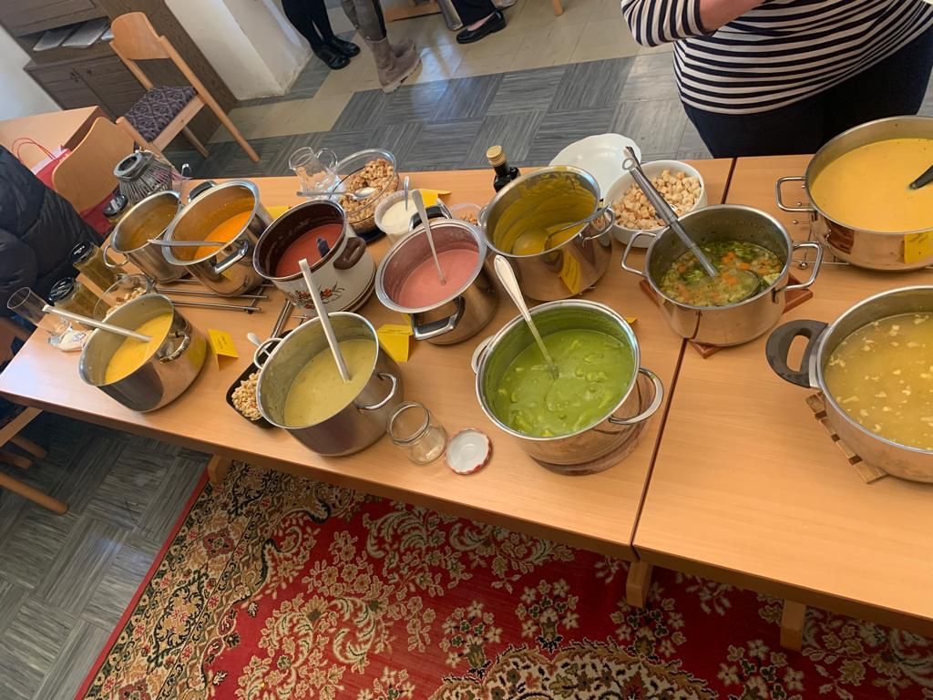 Anschließend gab es 16 verschiedene, köstliche Suppen zum Verkosten. Man konnte „Suppe im Glas“ mitnehmen, aber auch vor Ort konsumieren. Das Angebot wurde gut angenommen und viele waren froh, wieder in Gemeinschaft mit Anderen, Essen und Plaudern zu können.