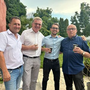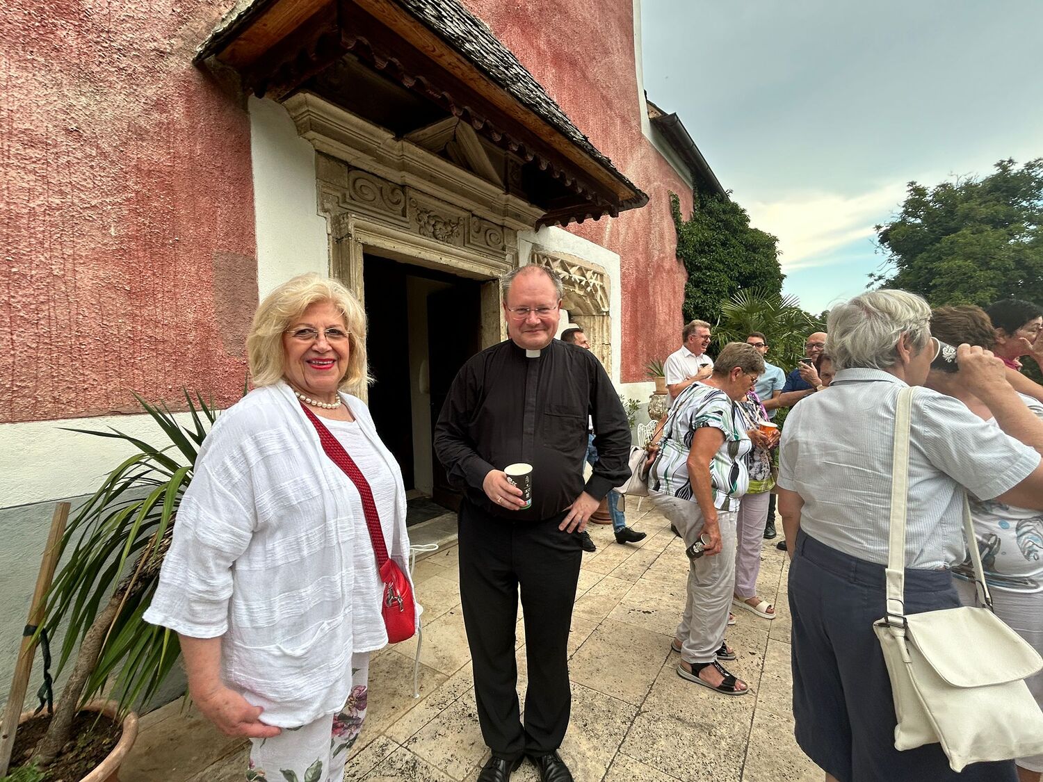 Nach dem Gottesdienst lud Dechant Shinto die Messeteilnehmer im Garten vor der Schlosskapelle zu einer Agape mit div. Gebäck, Grammel-Pogatscherl, Kuchen, Mineralwasser und Wein ein. Der Herr Dechant bedankte sich auch bei der Raiffeisenbank Draßmarkt-Kobersdorf-St. Martin und bei der Firma Waldquelle Kobersdorf für die Unterstützung und bei Schloss-Besitzerin Dr. Anna Schlanitz für die Möglichkeit, in der altehrwürdigen Schlosskapelle diese Hl. Messe zu feiern.