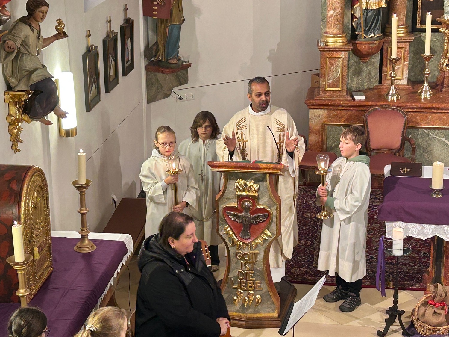 Die Geschichte vom Kornwunder, die Frau Religionslehrerin Doris Horvath vorlies, sollte den Kindern zeigen, wie viel Gutes Bischof Nikolaus den Menschen getan hat. Auch Pfarrer Shinto ermutigte die Kinder in der Predigt, dem Beispiel des Hl. Nikolaus zu folgen und anderen Menschen eine Freude zu machen.
